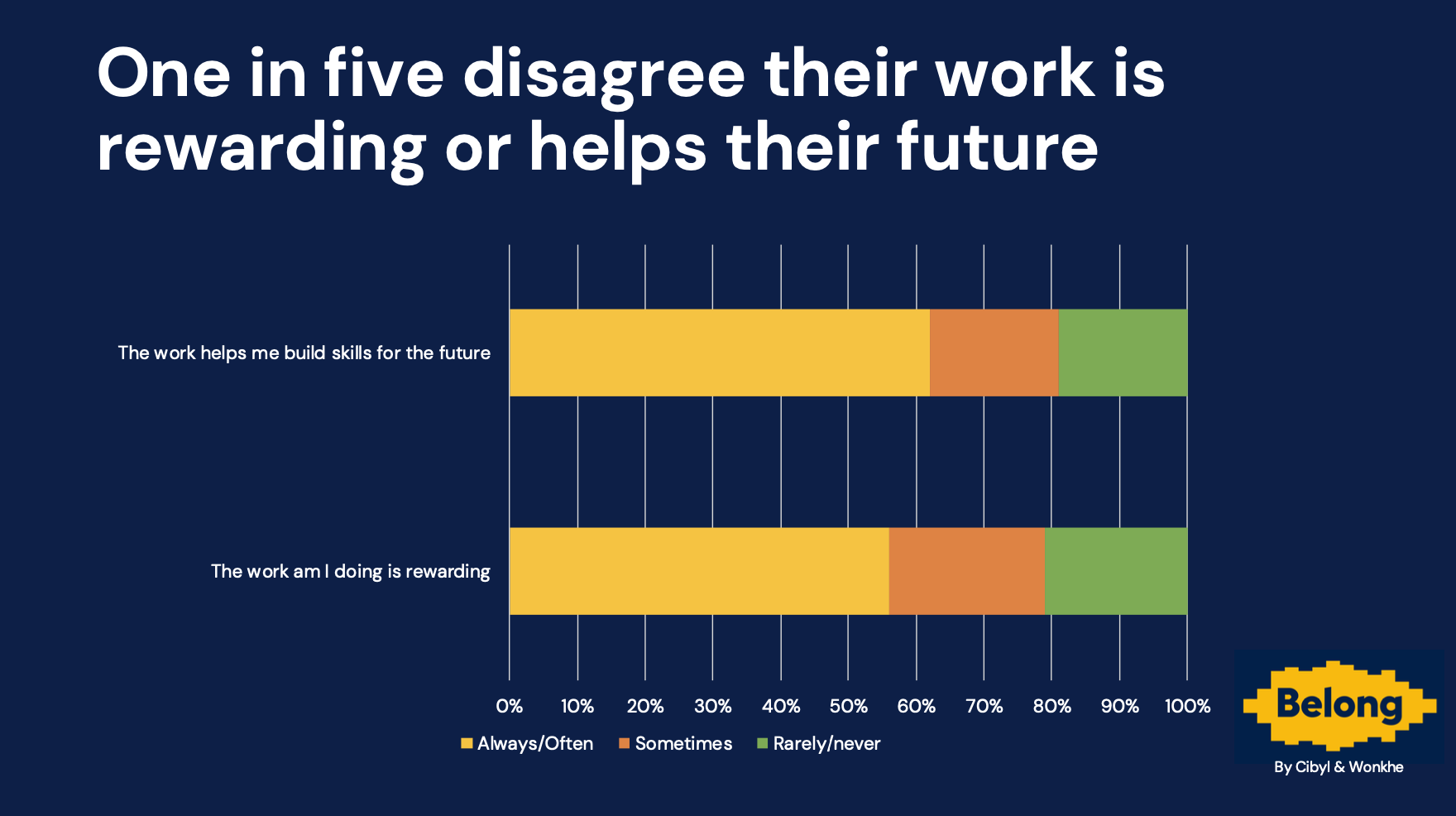 But in our sample only 56 per cent of students at work found their work rewarding, and only 62 per cent felt they were developing skills. The benefits of student work are neither universal nor evenly distributed – and again vary significantly by industry.