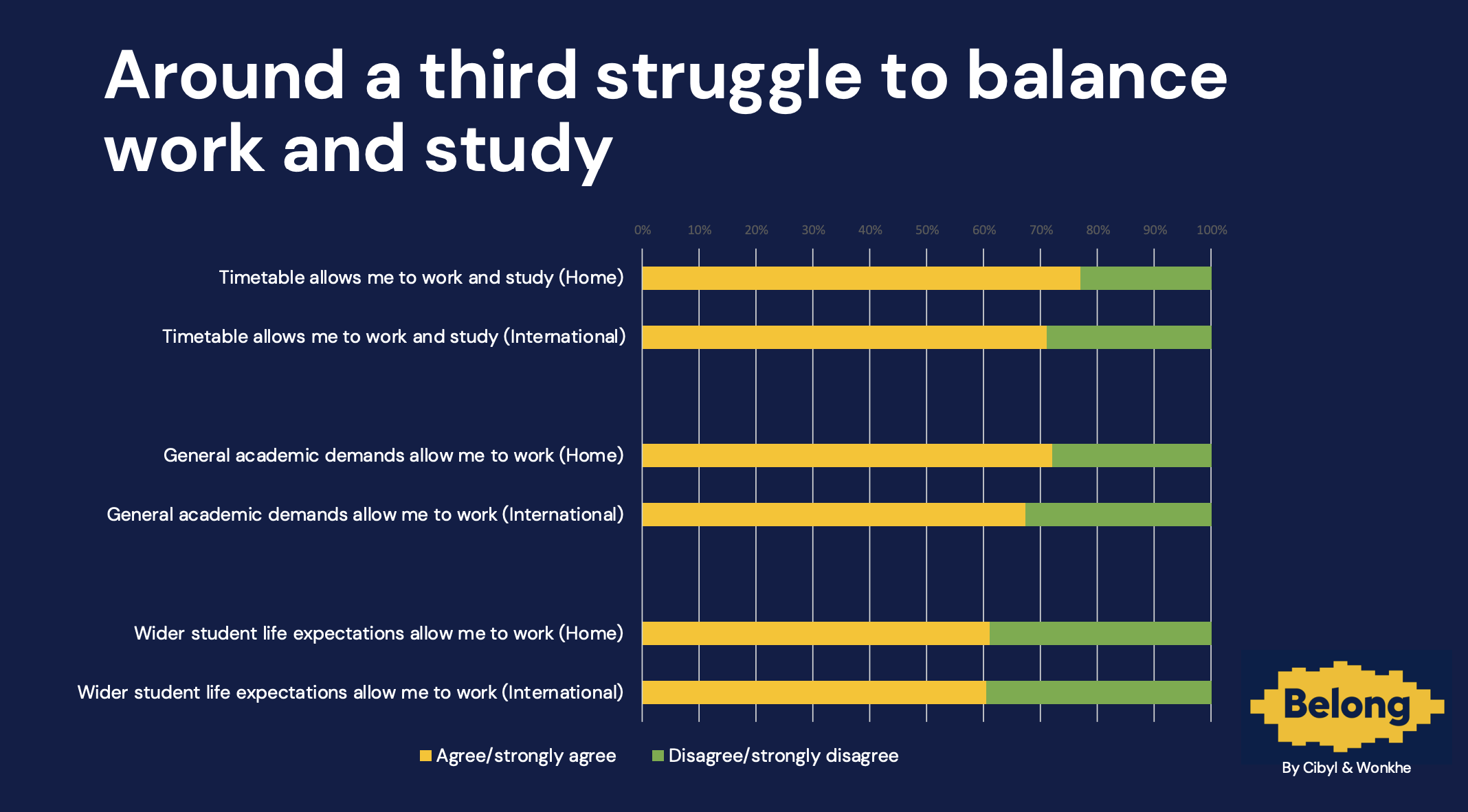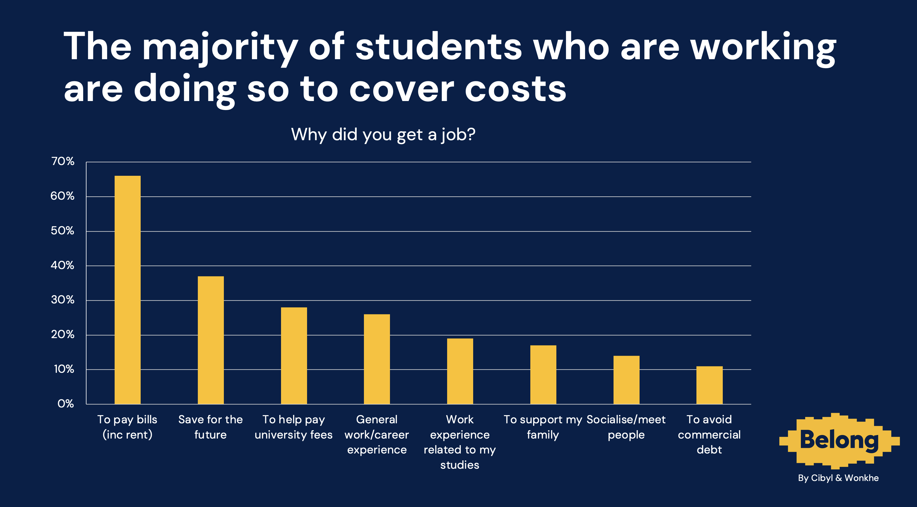 Our Belong polling has consistently found that institutional empathy and understanding goes a long way – both in terms of what is regarded as “normal” on campus by peers, and in the way in which micro-decisions and support conversations play out. Clearer communication between workplaces and providers are suggested by some, but far more make the simple observation that they would prefer not to be told, principally by academic staff, that working is a mistake. Students at least deserve respect and support for managing both roles, rather than condemnation: