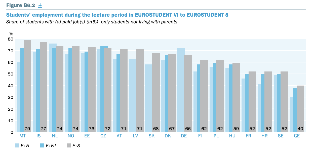 But those efficiency demands are not restricted to universities. Increasingly, efficiency is being demanded of students themselves. Eurostudent shows the volume of “full-time” students working during term-time is on the increase almost everywhere, as direct maintenance support comes under similar pressures.