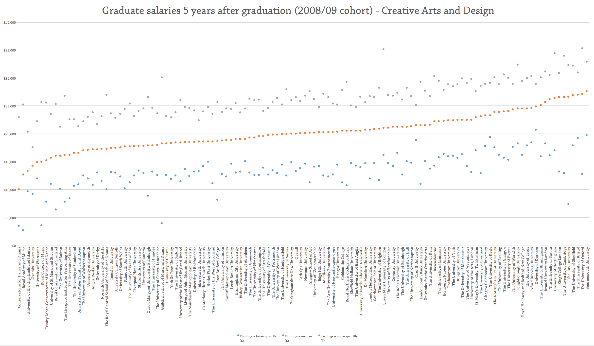 Extra caveats – such as a higher proportion of self-employed earners – apply when considering the earnings outcomes of Creative Arts and Design graduates. But nonetheless, the earnings outcomes for a number of creative courses, five years after graduating, make pretty bleak reading. Thirteen institutions have a median graduate salary at that time of under £17,000, below even the national median for young non-graduates.