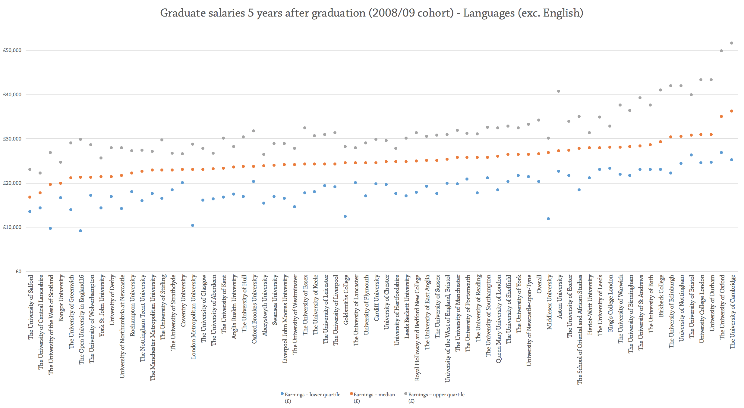The exception to the above is for Languages courses, not including English, which was separated from the former after the test release in December. The reason becomes clear when comparing the two subjects. While English graduates’ earnings tend to tail off, particularly at mid-to-lower tariff institutions, the returns on Languages courses are much stronger across the sector.