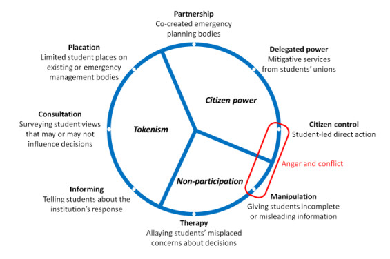 His paper – written in the teeth of the Covid crisis – makes a compelling argument that what Sherry Arnstein described in the late 60s as a “ladder” of participation pretty much turned into a circle during the pandemic – where the very highest and lowest levels of student engagement overlapped in a zone of anger and conflict.