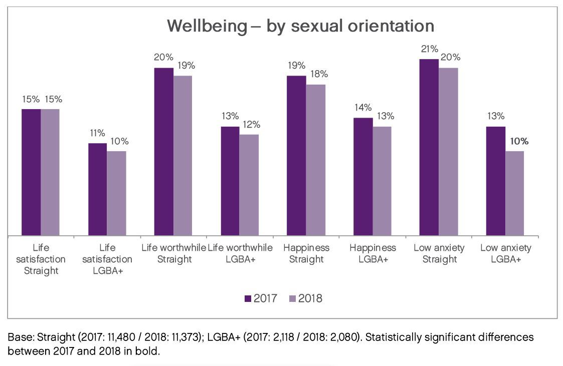 The 2018 Student Academic Experience Survey report by HEPI and the Higher Education Academy noted lower wellbeing scores among the LGBTQ+ population.