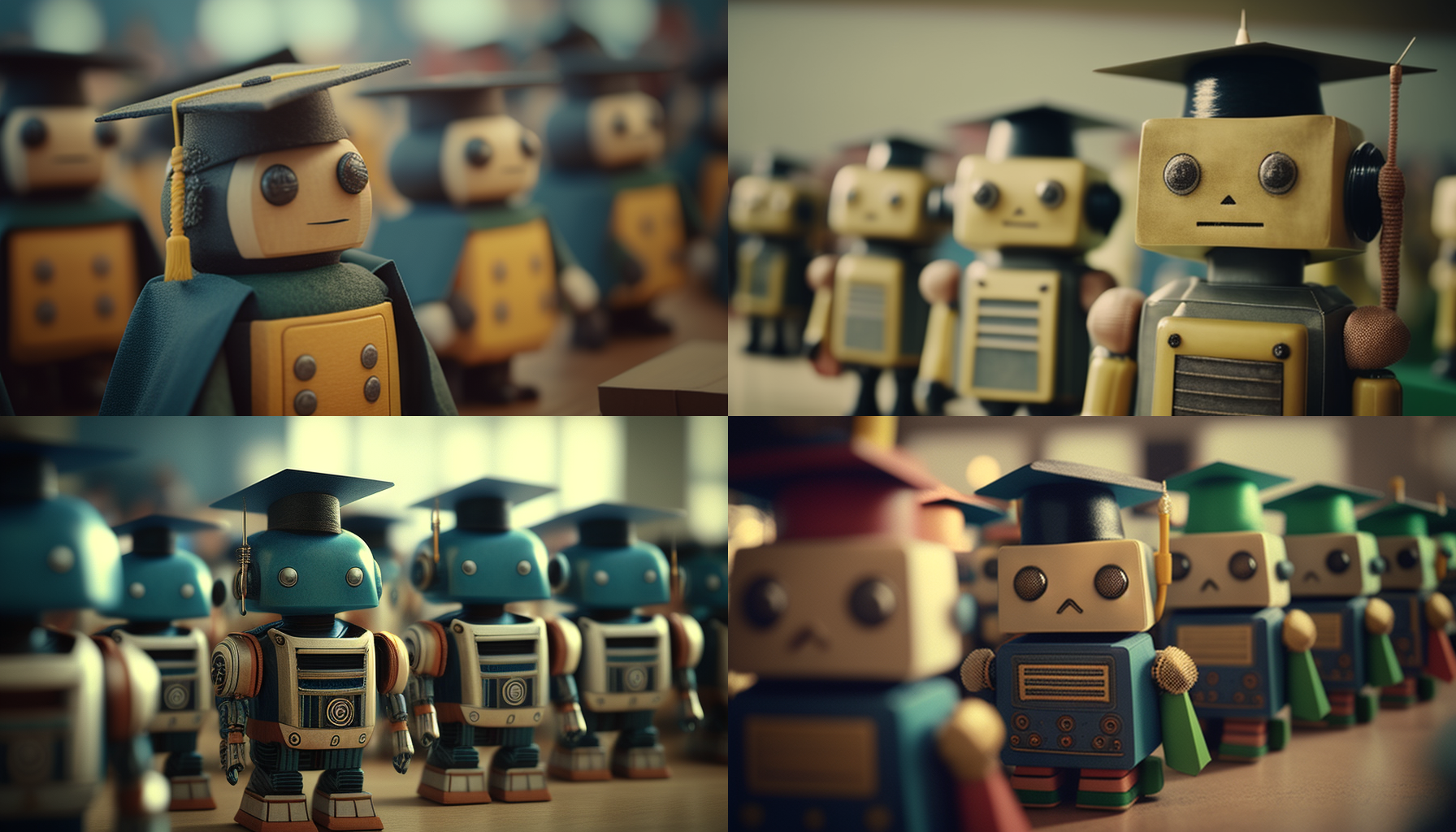 1970s style toy robot students at a graduation ceremony in the UK, realistic, natural lighting, detailed, 8k, RTX –ar 16:9
