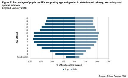 Aside from the now familiar deficits in boys’ attainment through all the key stages of education, my own contribution picked up new insights from last month’s DfE publication, Understanding KS4 Attainment and Progress. Among other things this report calls out two significant contributors to the male attainment gap. The first is special education needs, or SEN, which is a strong predicator of attainment. Boys are much more likely to be classed as having SEN (including statements or school action) than girls (15.2% of boys compared with 8.7% of girls).