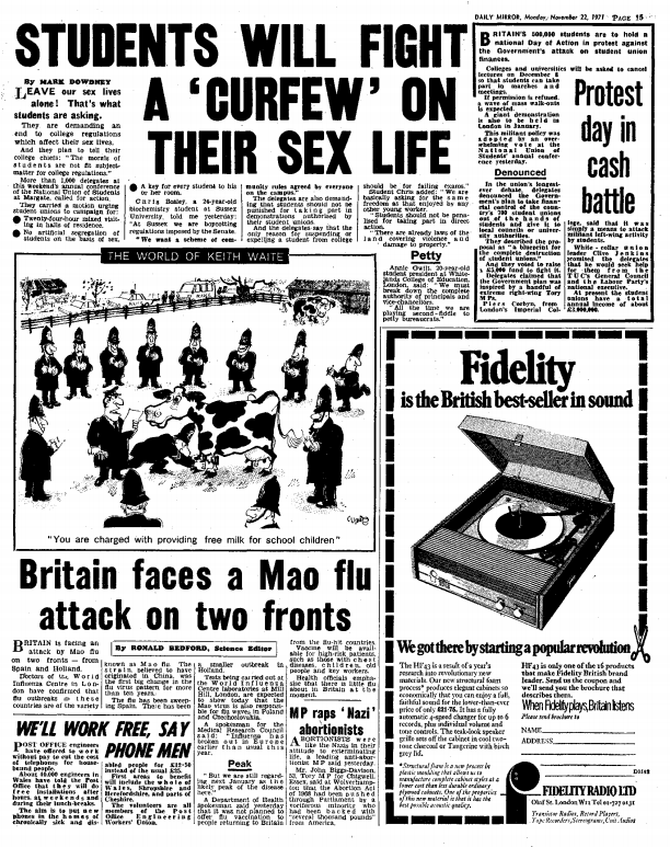Paternalism therefore lingered a little longer. A 1971 report on student residences quoted the bursar of a men’s voluntary college, who said “We try to give them as much freedom as is good for them. They have to be in at 11.15pm and two nights a week this is extended to midnight. We give them an hour after a dance, which is a reasonable time to see a girl home.” In November of that same year, “Students will fight a ‘curfew’ on their sex life,” was the headline in the Daily Mirror, reporting on an NUS conference motion that demanded “twenty-four-hour mixed visiting in halls of residence, no artificial segregation of student on the basis of sex [and] a key for every student to his or her own room.”