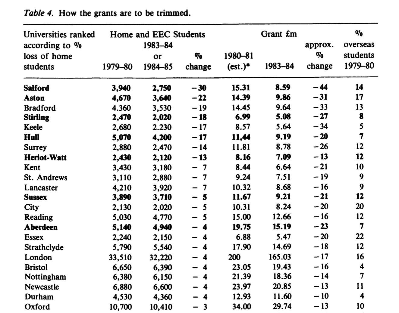 A long, long time ago in the late 1980s, when I started working in higher education, people and institutions still had the scars and were still feeling the aftershocks of the 1981 cuts to the sector. Back in 1981 the government imposed a 15% cut on HE which was then applied differentially across universities by the UGC – with some having single figure reductions and others facing much greater cuts. Salford University for example had a 44% reduction to its grant which led to 500 jobs being cut. The 1980s was a period of massive challenge for universities then and yet they all survived. It does rather feel that the sector is now facing its biggest test since those dark days. This table shows the scale of the reductions: