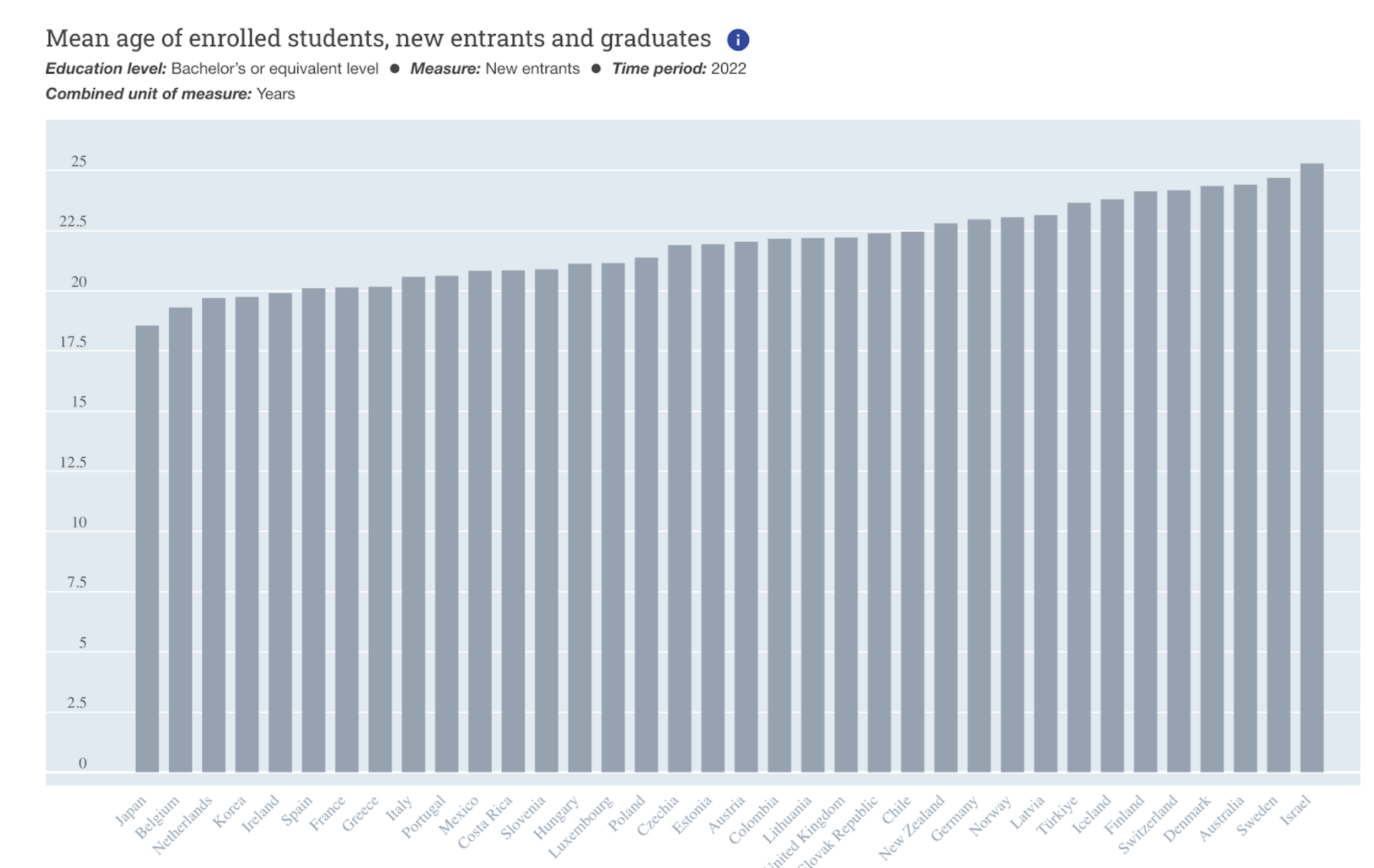Our undergraduates are pretty young – In Europe only Belgium, Greece and the Netherlands beat us on percentage of 18/19 year olds enrolled, and here’s the mean age of undergraduates on entry across the whole OECD. We’re in the middle of the pack on 22: