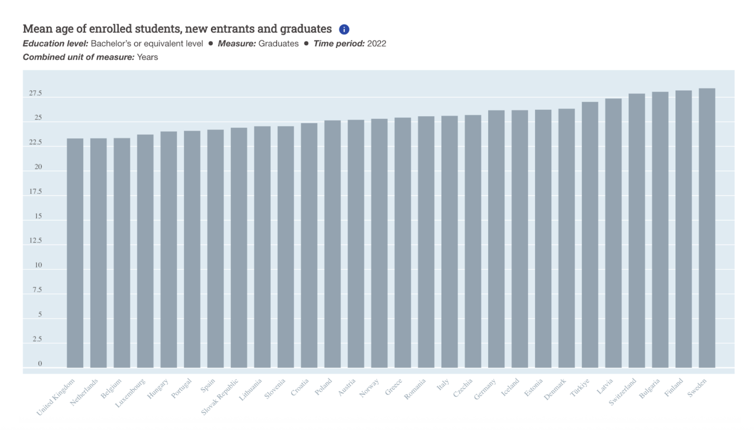 But here’s the distribution for the average age on graduation from a Bachelor’s, which suggests we have the youngest undergraduate graduates in Europe: