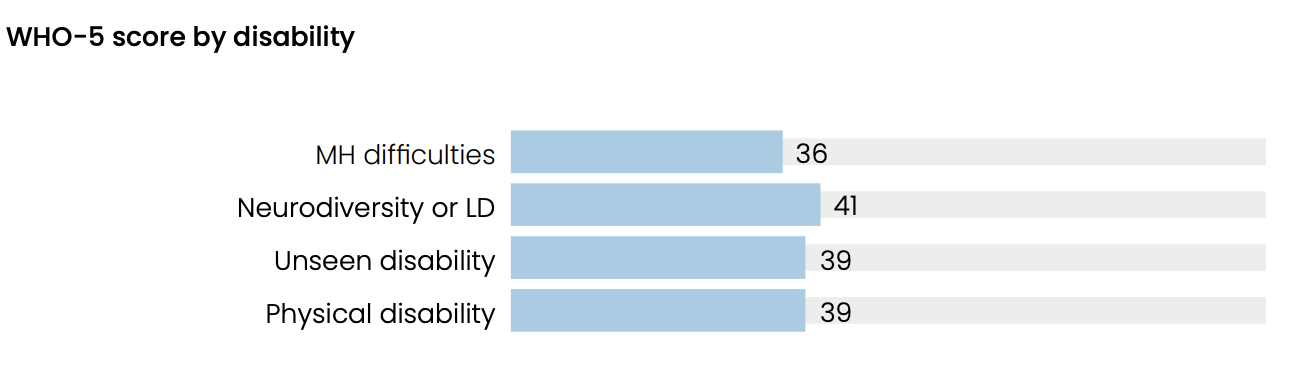 Commuting time created additional strain, with wellbeing decreasing progressively as travel time increases – students commuting over 60 minutes each way showed notably lower scores than those with shorter journeys.