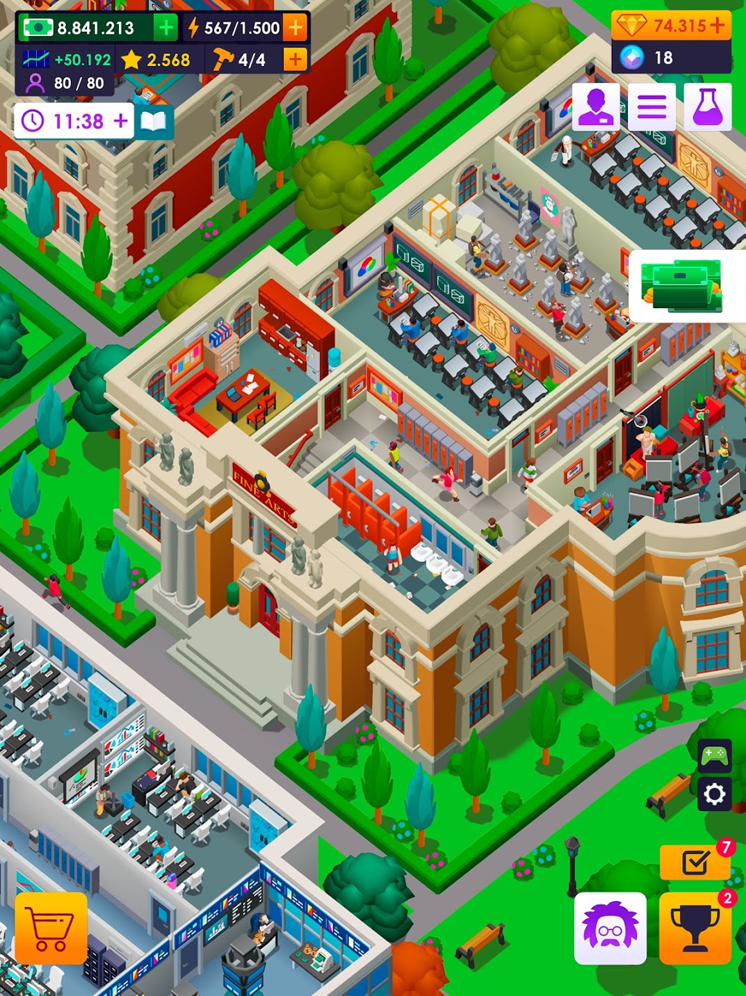 Deal with the needs of employees and students, and take the proper decisions to expand your business successfully. Customize the classrooms, improve the administration department, provide the best sports facilities to students, or invest your idle money in hiring the best lecturers. Every single choice you make will have an impact on your growth strategy!