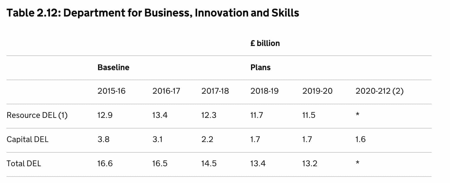 BIS will reduce departmental administration spending by a further £100 million by 2019-20. This will contribute to a wider programme of reform, including further reducing the number of Arm’s Length Bodies (ALBs), unlocking efficiencies through increased digitisation and increasing the pace of estates and workforce reform. The bonfire of the quangos may continue then, although we’ll have to wait for more detail as to exactly how. Some savings will be made when the Office for Students opens as universities will need to pay for this as a subscription.