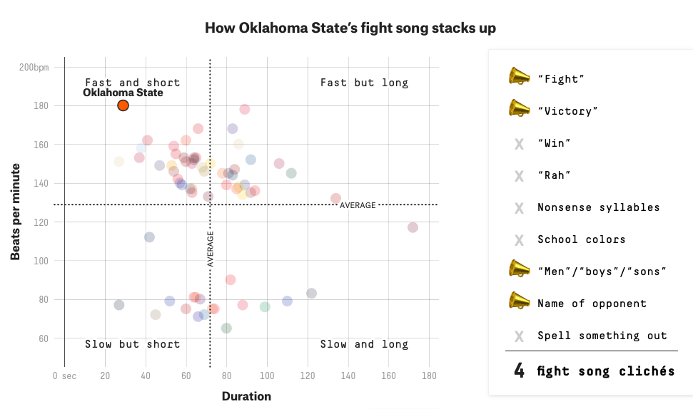 We gathered the fight songs of 65 schools — all those in the Power Five conferences (the ACC, Big Ten, Big 12, Pac-12 and SEC), plus Notre Dame — to see exactly how these teams are musically willed to victory. We counted which clichéd elements (like shouting “Rah!” or spelling something out) appear in each song’s lyrics and determined how fast the song is played and how long it lasts (for the version available on Spotify).