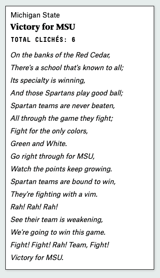 Given they are known as fight songs it is perhaps unsurprising that 44 include the word “fight” — usually more than once – and 41 use either “win” or “victory;” 18 use the word “rah” and 10 use some other nonsense syllable. Hurrah!
