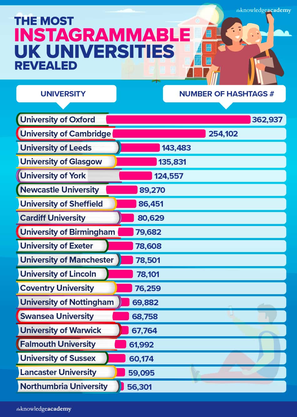 University of Cambridge is runner-up, with 254,102 Instagram hashtags – 108,835 LESS than Oxford