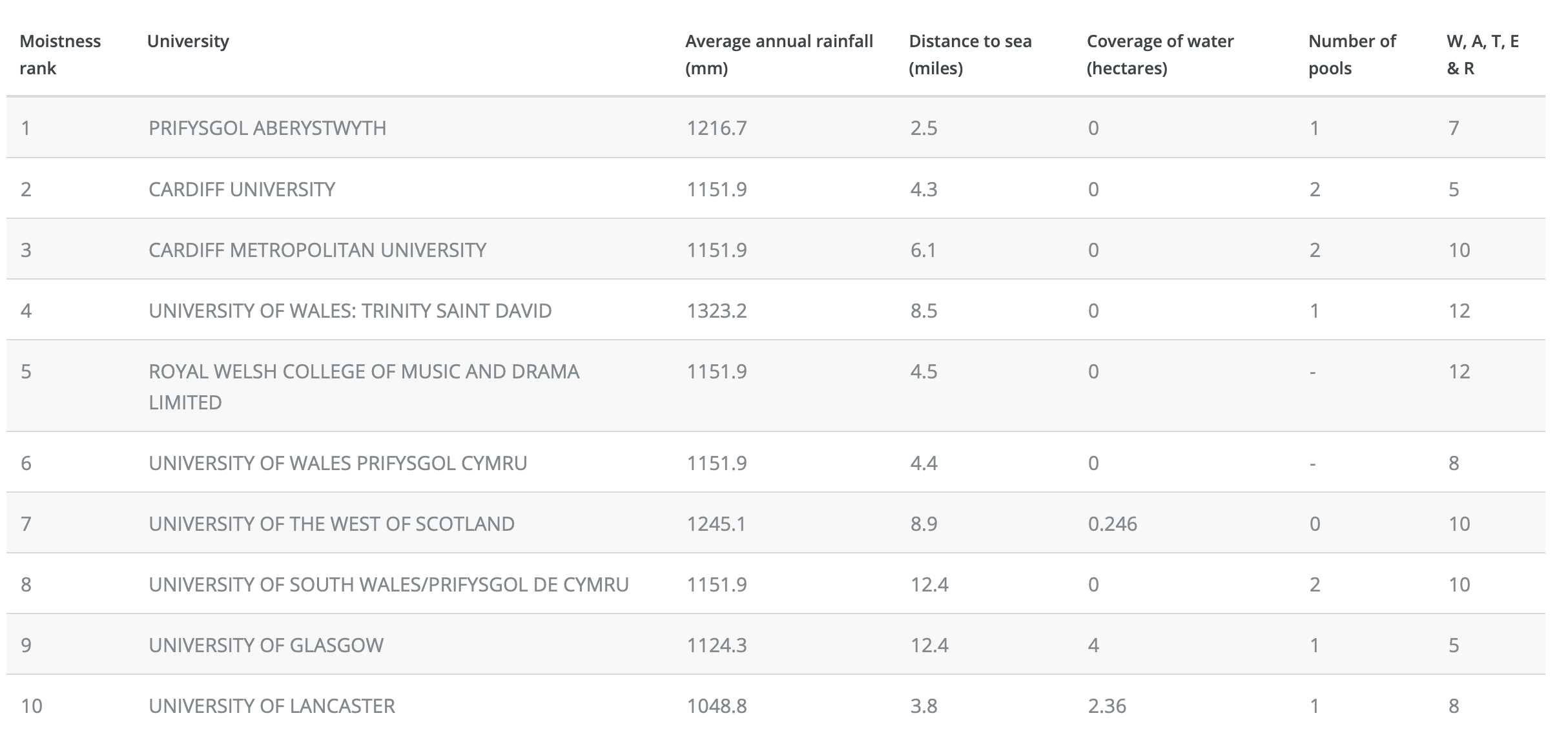 The rankings are based on five key metrics: average annual rainfall (source: Met Office, nearest climate station), distance to the coast, area of campus covered in water (source: HESA), number of swimming facilities (source: CUG and BUCS), and the number of the letters W, A, T, E and R in the university’s name. These metrics are weighted 75%, 10%, 10%, 4.5% and 0.5% towards the final ranking. The rankings are based on main campus postcodes only.