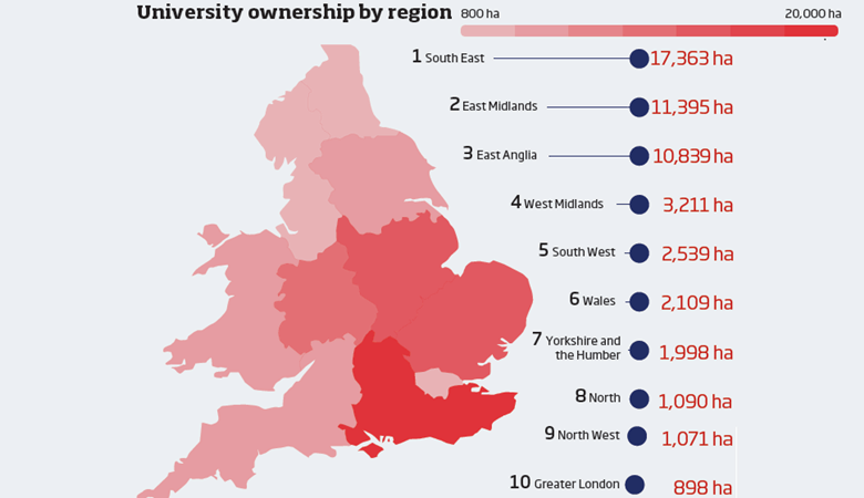 Universities in England and Wales own more than 52,000 ha of property and developable land between them.