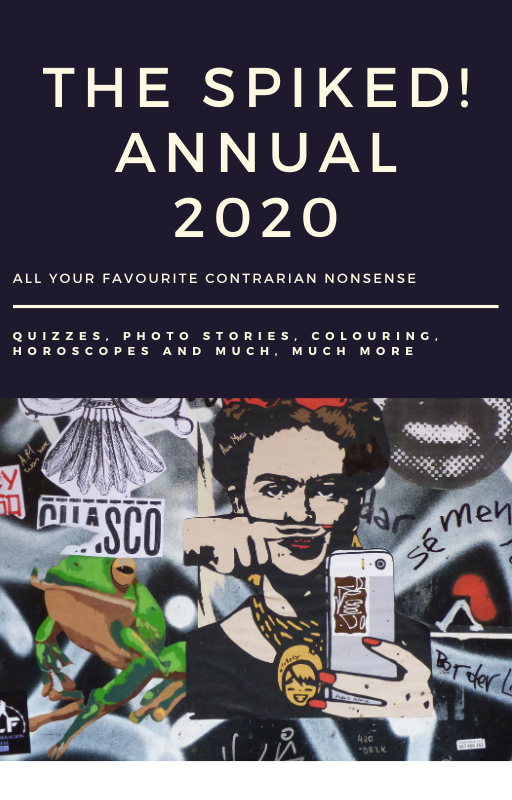And of course we could not ignore everyone’s favourite festive read – it’s the Spiked! Annual 2020. With all your favourite pseudonymous scribblers adopting wilfully contrarian positions on just about anything. There’s pull out picture spreads, photo stories, horoscopes, interviews with the stars (including an exclusive chat with the first man to scale Brendan O’Neil’s imposingly craggy forehead), quizzes, puzzles and colouring in. This year’s annual features a fake ermine lining in recognition of the key role in the Lords and in No 10 now being played by contributors to this illustrious journal.