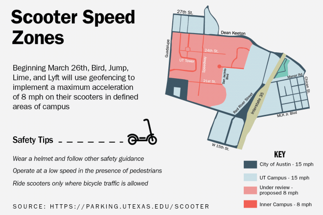 The speed limit will be enforced by a virtual geofence using GPS. Once a scooter enters the geofenced area on campus, the device will gradually decelerate down to 8 mph. The new geofenced speed zone is a precautionary measure for the safety of everyone on campus, according to the PTS email.