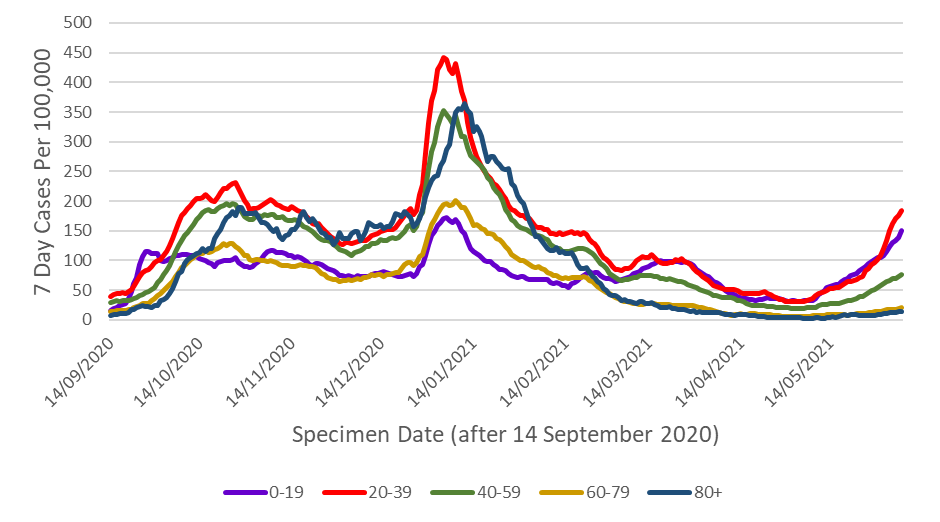 There’s a helpful bit on policy context that notes that at the time of writing, cases are growing exponentially, that the Delta variant is more transmissible, and the uncertainty regarding the impact of Delta on severity of illness, treatment or reinfections. Clearly given the way vaccination roll out is being handled, locations where groups of younger people gather are thus likely increasingly to become the focus of outbreaks not least because the biggest increase in interactions has been between those aged 18-29 with each other: