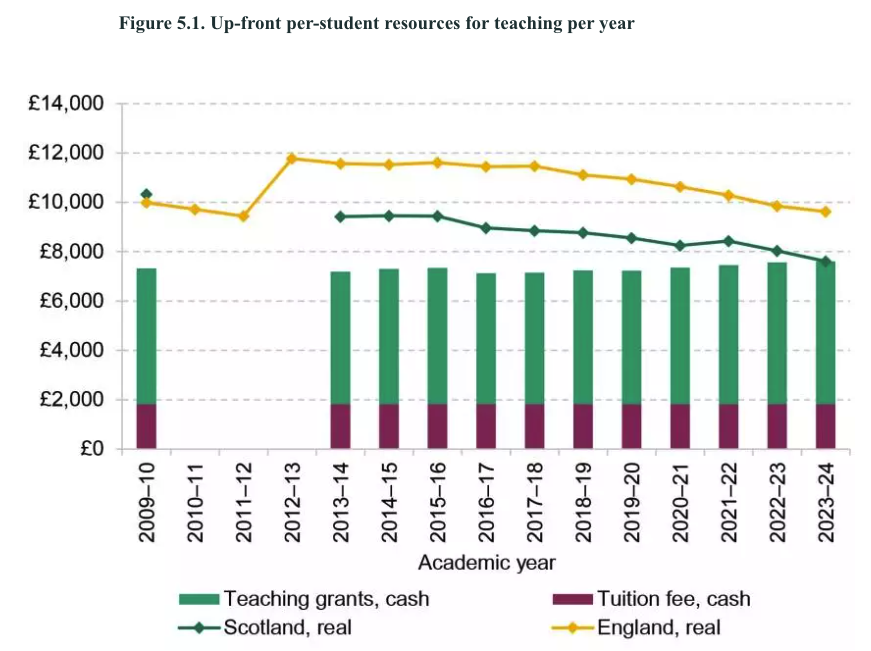 It quotes a London Economics paper that suggests that higher education institutions in Scotland receive approximately 23 per cent less funding per student than their counterparts in England – which does raise the uncomfortable question of how any university in Scotland is surviving given the apparent funding crisis in England. Here’s the IFS version of those figures: