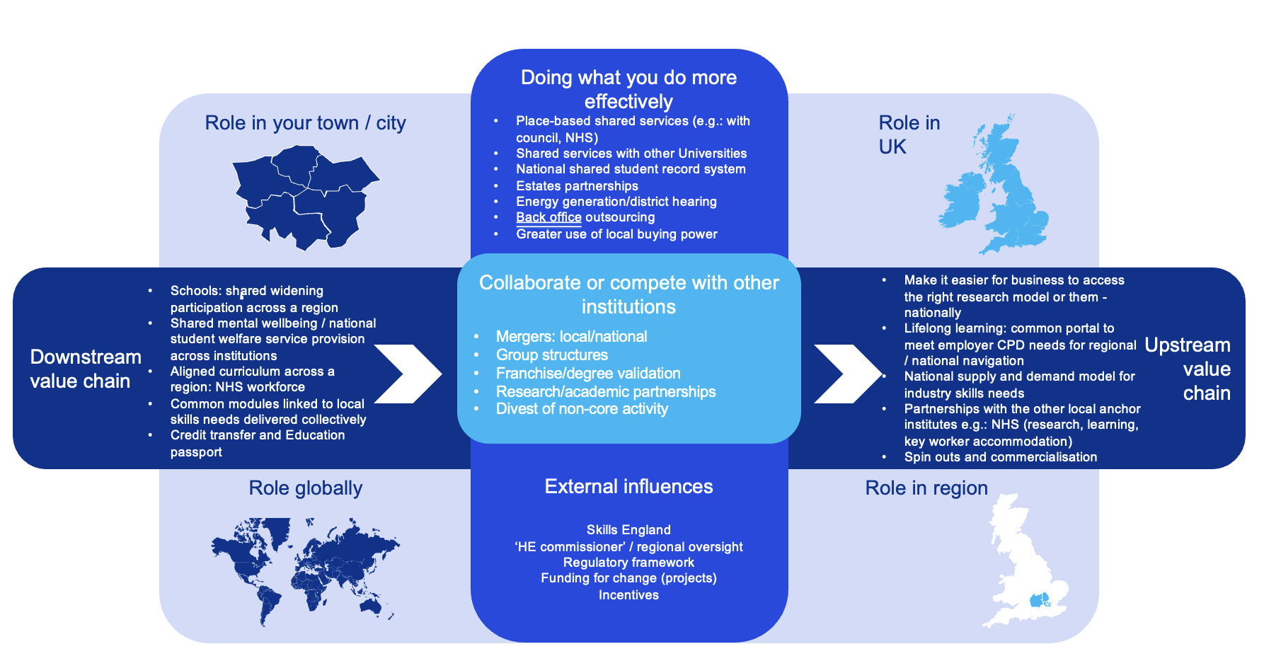 Seen from a macro policy perspective the equivalent question is which shared policy goals might be more efficiently and impactfully realised through coordination? One way of answering this is to look at the system as a whole and where there are similarities in practice that could (with a bit of persuasion) be replicated or outsourced to a third party to save endless reinvention of wheels. Another is to look at the system from the “outside” – see the sector through the eyes of the prospective student, the business or employer, or local or regional policymaker, and ask how they can most easily and seamlessly get what they need from the system to achieve the wider goals of education access, economic growth, regeneration, public sector productivity, decarbonisation, and so on.