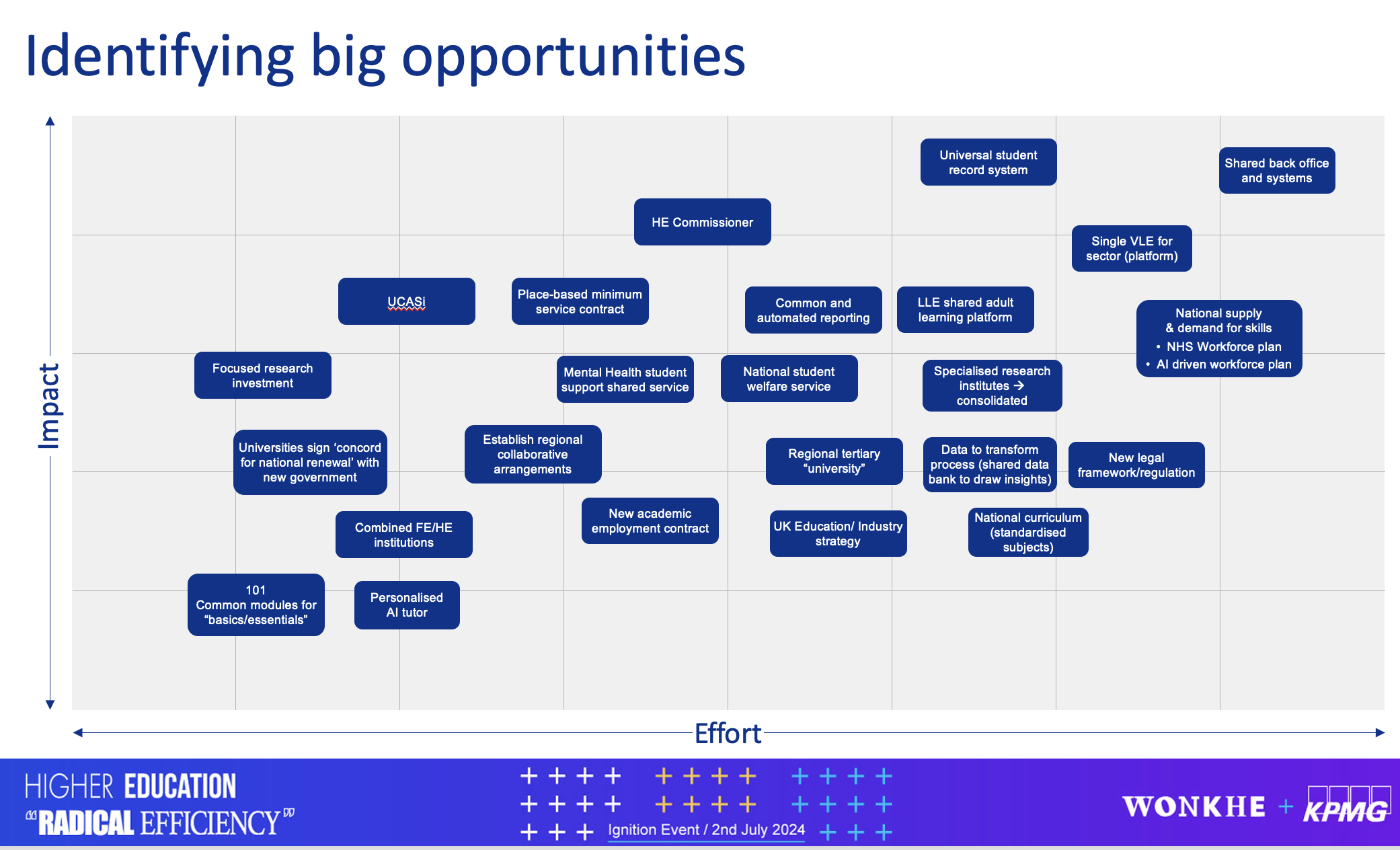 In early July, Wonkhe and KPMG brought together a carefully selected squad of higher education sector and institutional leaders, thinkers and strategists to engage in a structured discussion about opportunities for a more radical approach to pursuing efficiency through collaboration. We wanted to see if it was possible to startle ourselves out of the usual conversational grooves of “nice idea but too hard” and collectively generate some big ideas that could give some shape and momentum to discussions about sector transformation and long term sustainability. Our aim was, by approaching the conversation in a collaborative manner with the right people engaged, to move beyond the warm words and theoretical and into the practical across a range of options.