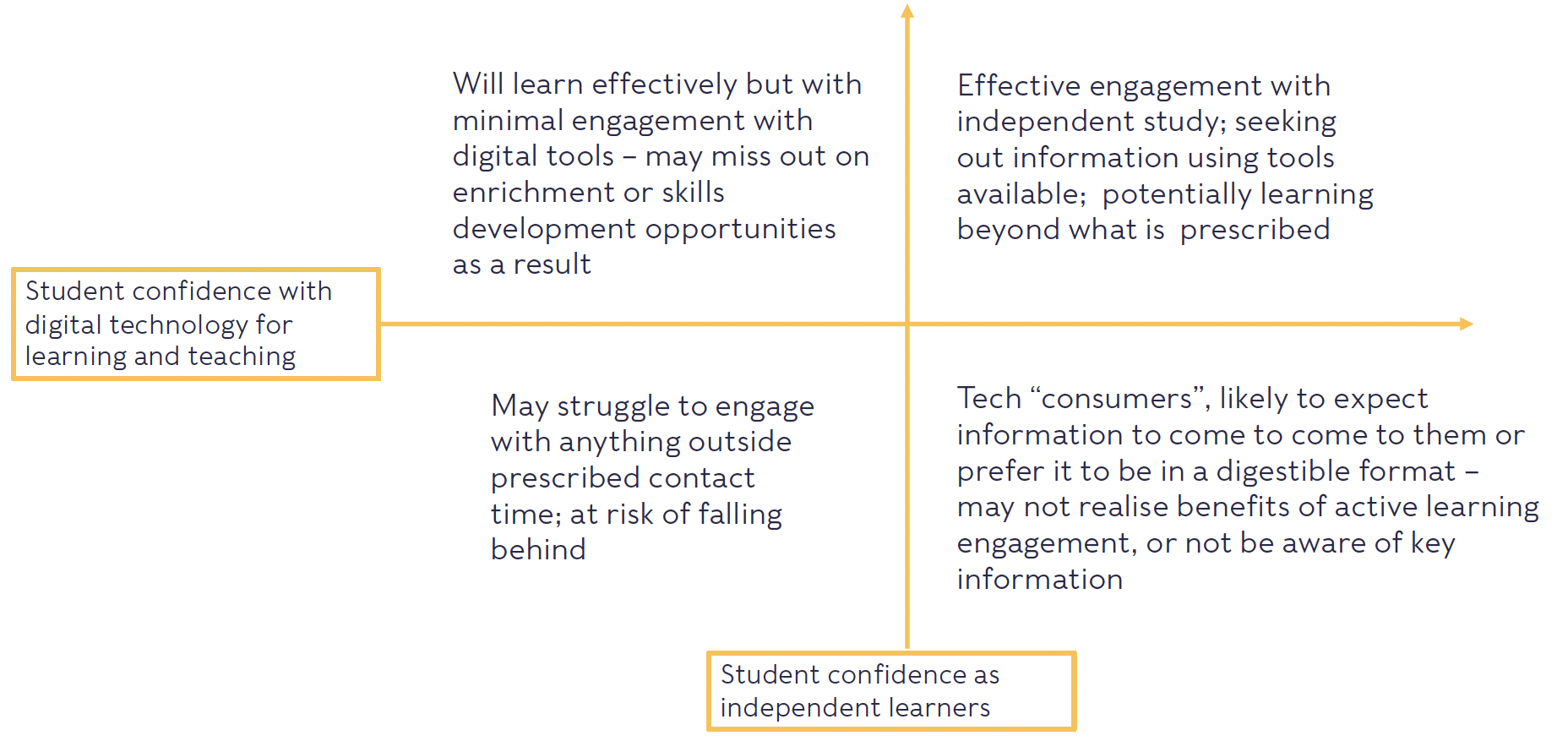 Not embedding clear expectations for students’ digital engagement potentially has important consequences for student success. A lot of responses explored the intersection between a very mixed picture of students’ capabilities and confidence with digital technology, and students’ core motivations and degree of independence as learners. Post-Covid, while academics might use digital tools as part of in-person teaching, arguably the bulk of students’ digital learning engagement is in their independent study. Simply knowing how to use the various tools and platforms available is not sufficient – students must develop the skills to learn independently.