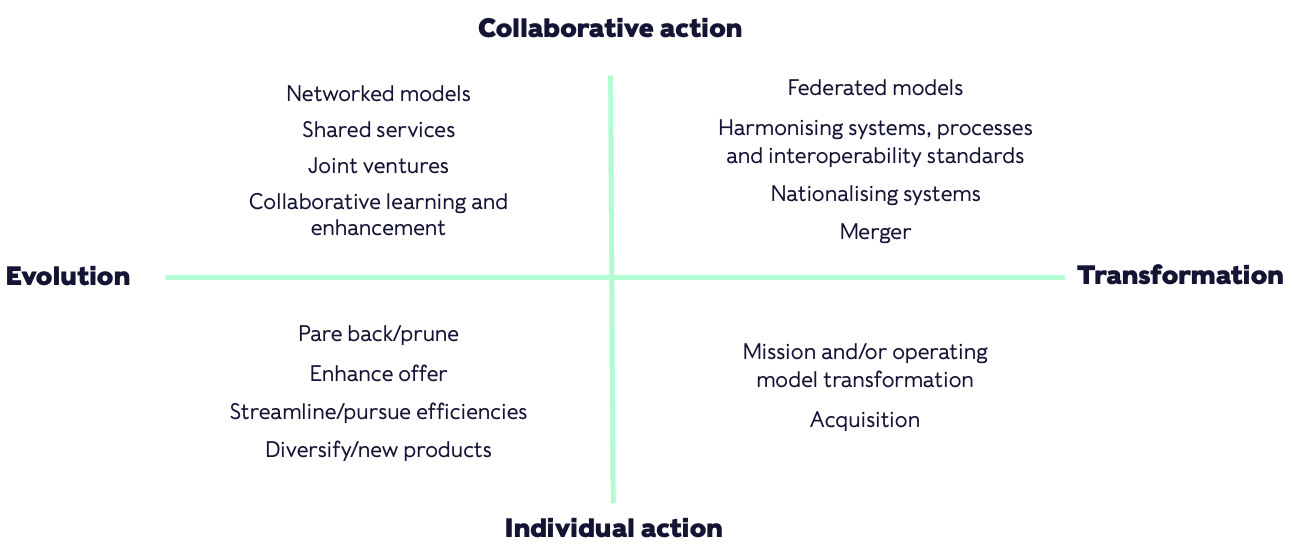 One is that I think it hugely unlikely that the sector will coalesce into one of the quadrants or even at the top or bottom of the model. I think we will see activity in all four quadrants depending on the context – and I think that policy should seek to support all four forms of change to give the sector the best chance of making a good fist of it. I have found arriving at this conclusion oddly freeing, as it stops the circular argument of advocating any single activity such as income diversification, or merger, or shared services, as a unified answer to the sector’s challenges. It is possible to argue, as we have at Wonkhe, that the policy environment could be more conducive to supporting radical forms of collaboration, without suggesting that all institutions must now hasten to adopt these forms if these do not serve wider missions and objectives. Likewise, it does not necessarily follow that introducing mechanisms to support collaboration would reduce competitive pressures in some parts of the sector or geographies, and the sector may collectively need to make its peace with that.