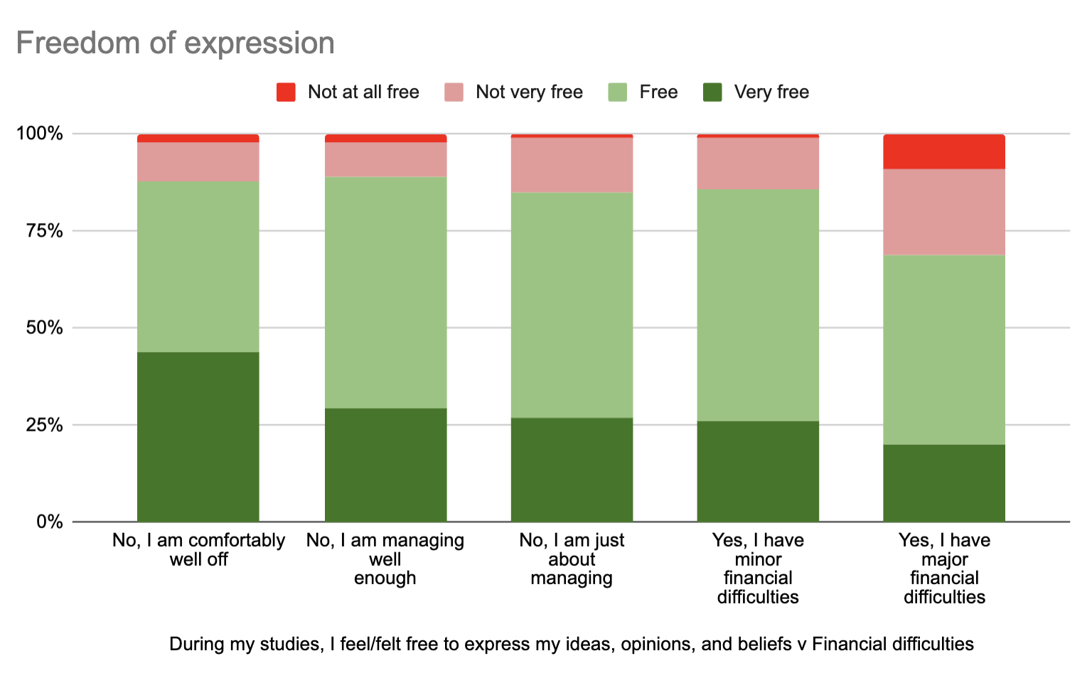 But these are not the only ways in which students’ financial situation can impact their experience. If we take the NSS question on freedom of speech, those who assume that the silent are all “anti-woke” be surprised by these numbers: