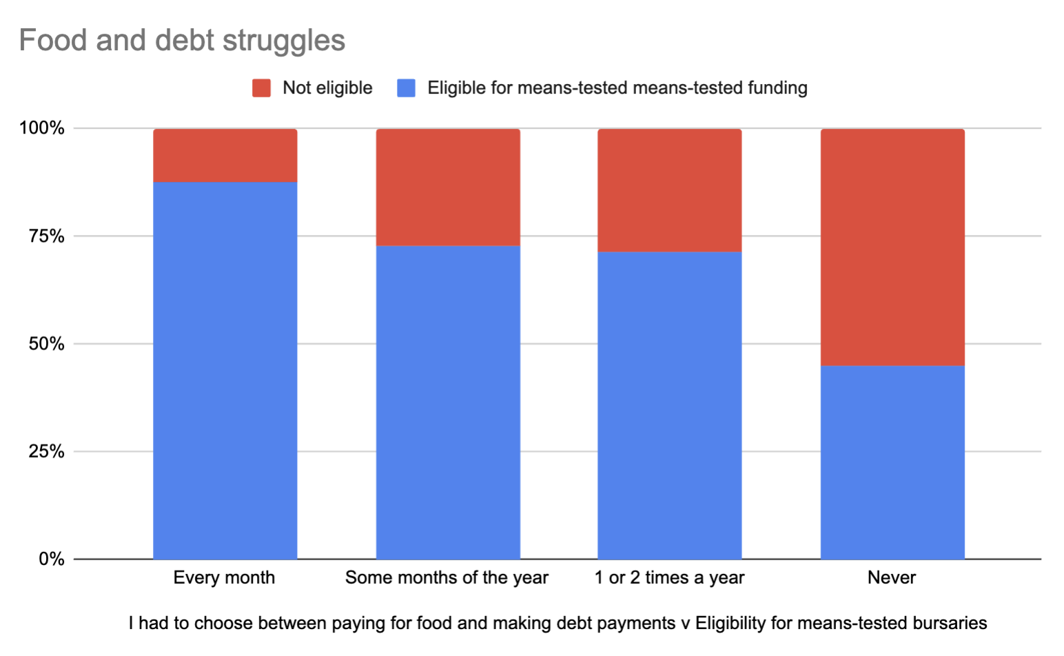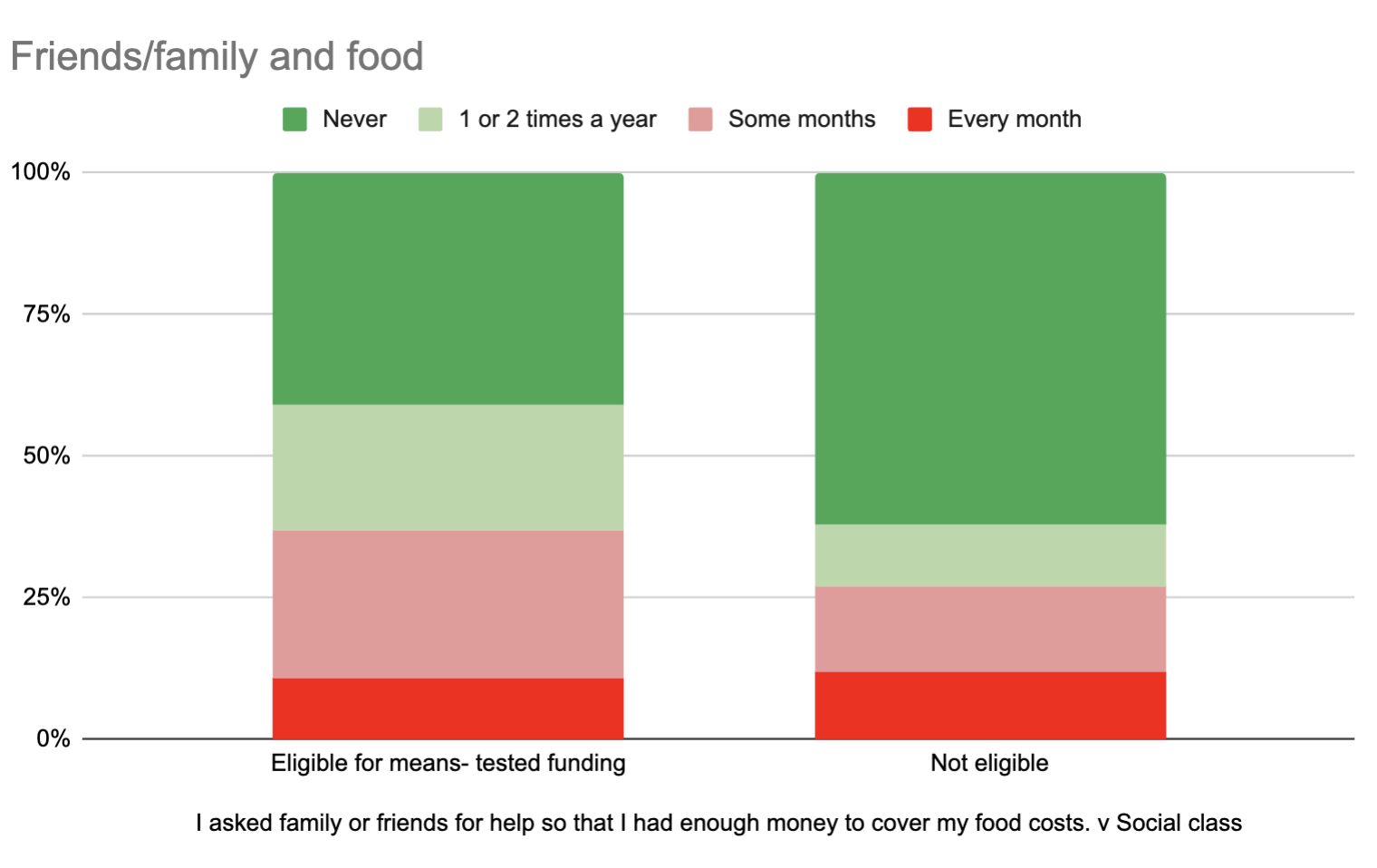 So in our polling, we also wanted to look at whether those needs were being met – and to do so, we used a selection of the factors in the Staffordshire University/Purpose Coalition basic needs survey, and a couple of proxies for relative disadvantage – whether (home) students were entitled to a means-tested bursary, and social class.