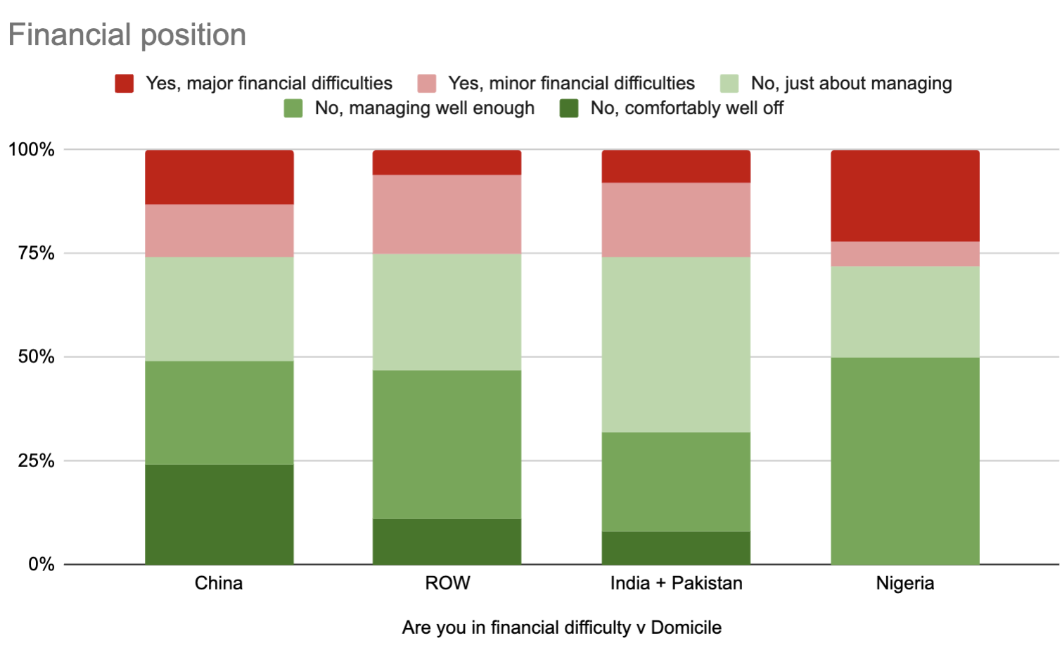 And if getting on for a quarter of students from Nigeria are saying that they have experienced “major” financial difficulties this year, no wonder many are struggling to pay fees: