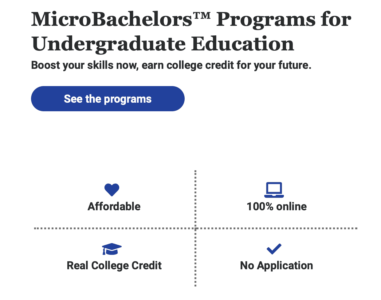 No matter if you have some or no college experience, MicroBachelors programs are built for adult learners looking to progress their career. Created by top universities and influenced by Fortune 1000 companies, edX’s MicroBachelors programs are the only path to a Bachelor’s degree that make you job-ready today and credentialed along the way. Now you don’t have to wait years to change your future.