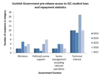 First, the gratifyingly wonkish evidence. Every June, the Student Loans Company provides the latest data on student borrowing and repayments for each UK nation. Since 2013, it has also published the list of people given “pre-release access” to these statistics. In 2013, those in the Scottish Government given sight in advance were the Cabinet Secretary for Education and a junior minister, a couple of particularly senior civil servants, one special adviser, one person from the communications team, and ten people who might be broadly described as having a technical interest, because they worked directly on higher education policy, or were statisticians or economists.