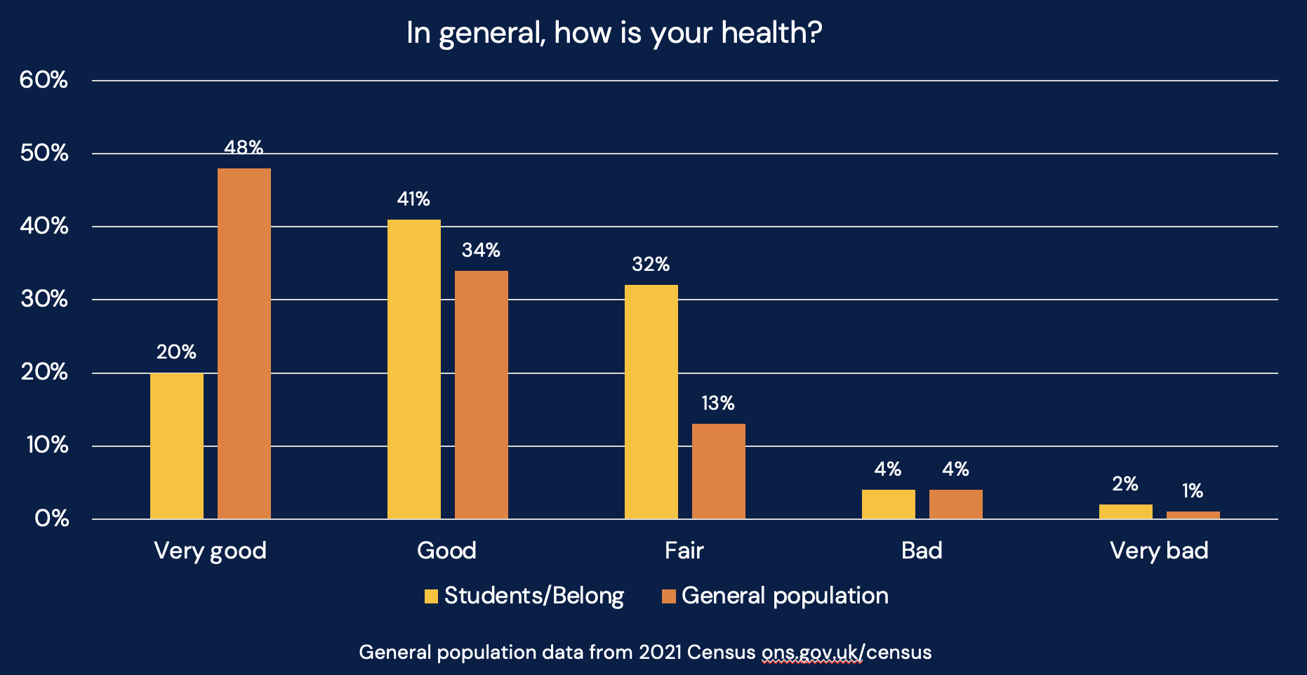 Combined figures show that while 61 per cent of students report “good” or “very good” health (compared to 82 per cent in the general population), a full 32 per cent describe their health as merely “fair” – nearly two and a half times the rate in the general population.