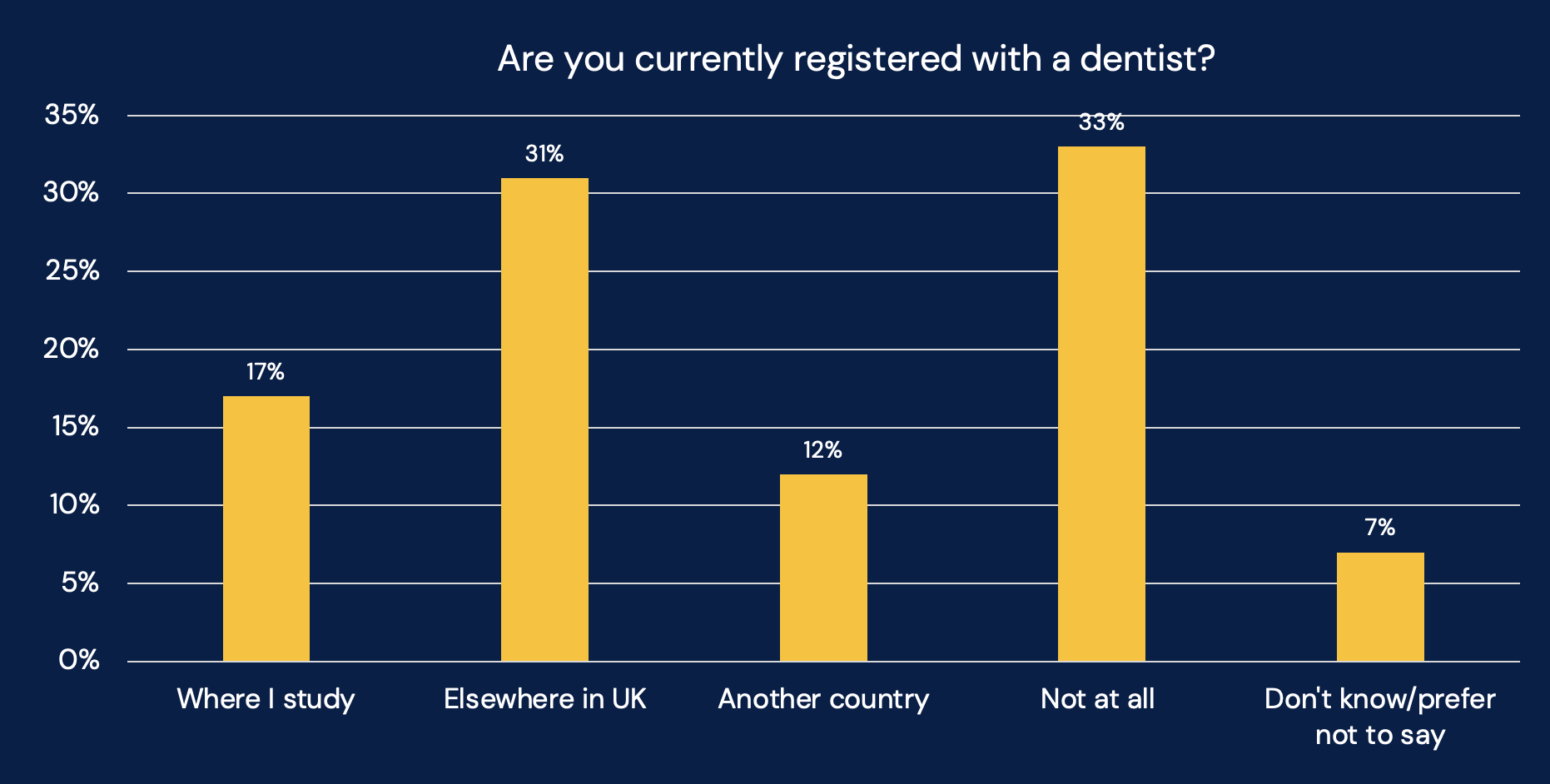 Dental registration shows a more concerning pattern, with a third of students (33 per cent) reporting they are not registered with a dentist at all. Only 17 per cent are registered near their place of study, while 31 per cent maintain registration elsewhere in the UK and 12 per cent in another country: