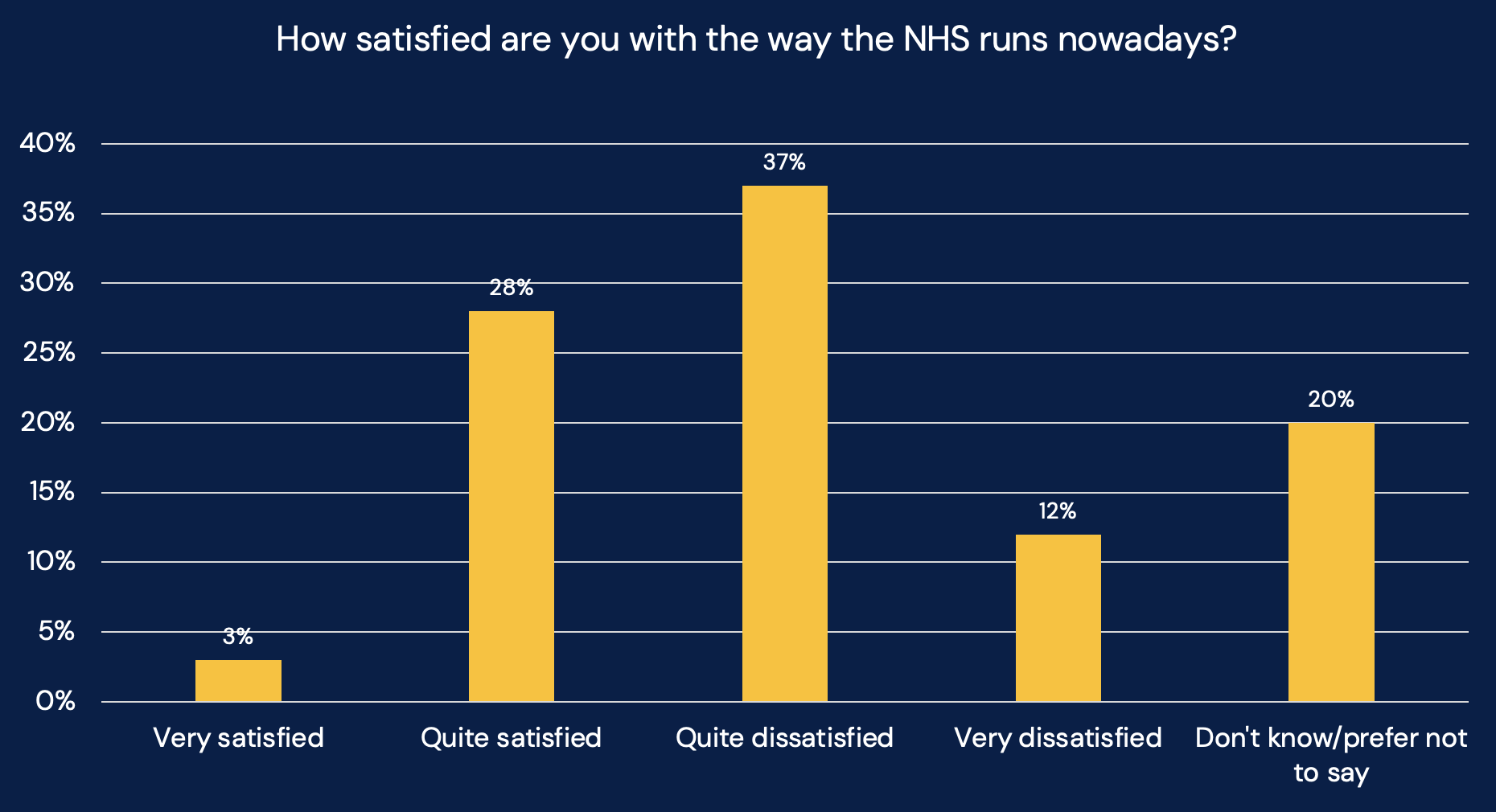So we wanted to know what students think. In our polling nearly half (49 per cent) reported being either “very dissatisfied” (12 per cent) or “quite dissatisfied” (37 per cent) with the NHS. In contrast, only 31 per cent expressed satisfaction, with a mere three per cent indicating they are “very satisfied”: