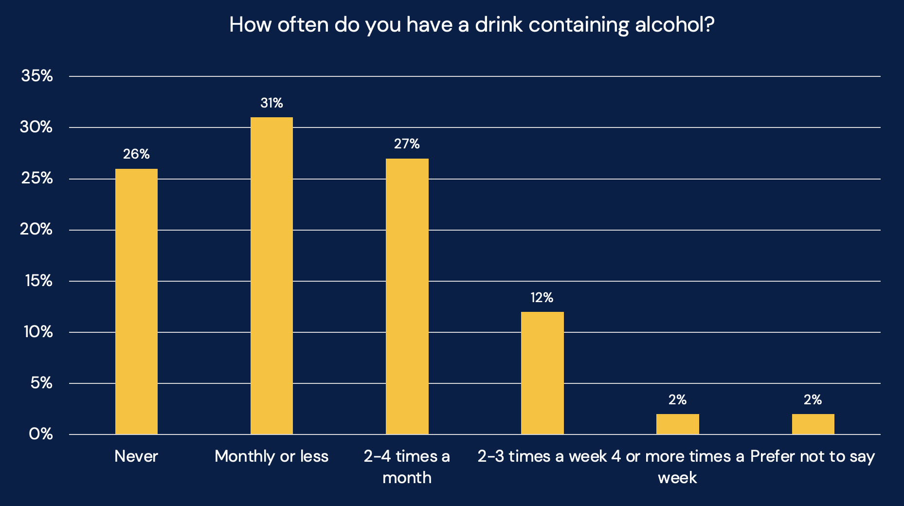 Plenty of press stories surround the idea that Gen Z is more likely to be clean living and teetotal than previous generations. Our polling suggests that 26 per cent of students never consume alcohol – a slightly higher abstention rate than the general adult population, where according to the latest NHS data 19 per cent report not drinking in the past year.