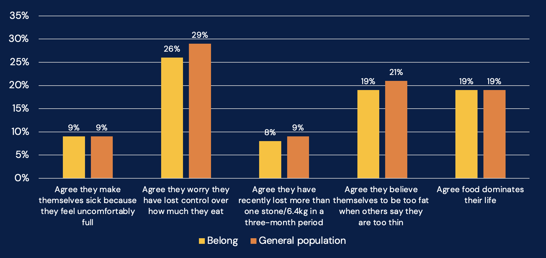 - 25 per cent demonstrated possible issues with food or body image (compared to 23 per cent in ONS)
