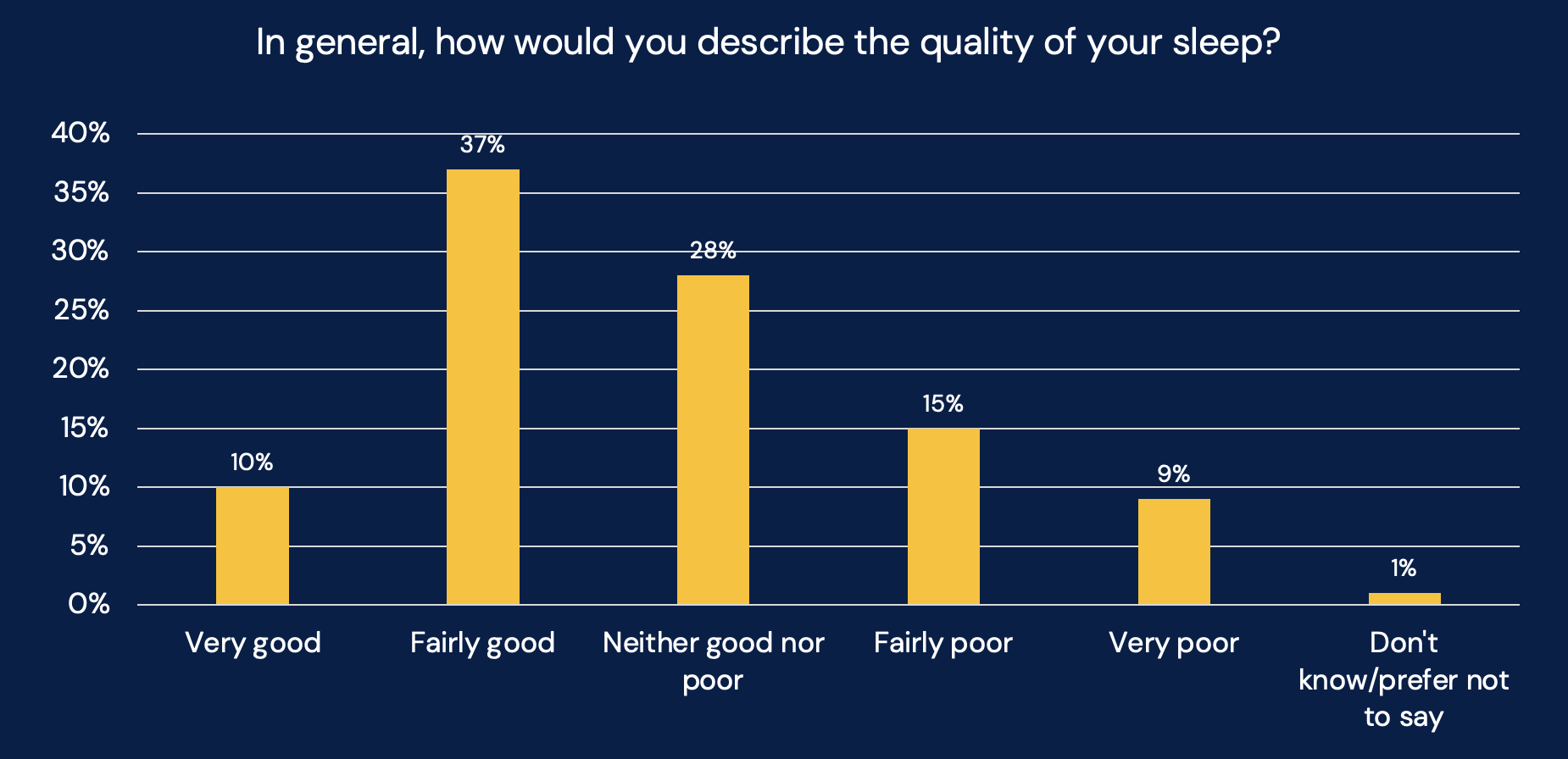 Sleep and rest is a huge part of health. Our results show a mixed picture over quality and quantity. While 47 per cent of students report “very good” (10 per cent) or “fairly good” (37 per cent) sleep quality, nearly a quarter (24 per cent) describe their sleep as “fairly poor” (15 per cent) or “very poor” (nine per cent). More than a quarter (28 per cent) fall into the middle category of “neither good nor poor.”