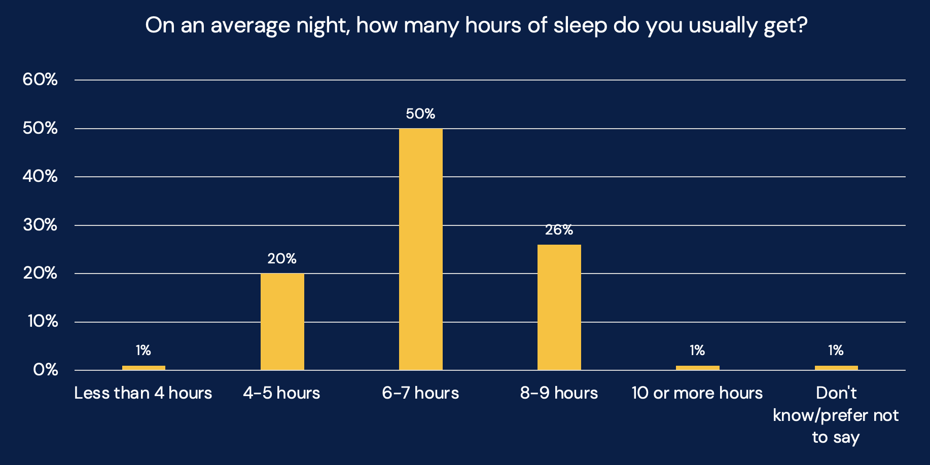 When it comes to sleep duration, half of students (50 per cent) report getting six to seven hours of sleep per night on average, with an additional 26 per cent getting eight to nine hours. However, a concerning 21 per cent are sleeping fewer than six hours per night, with 20 per cent getting just four to five hours and one per cent less than four hours.