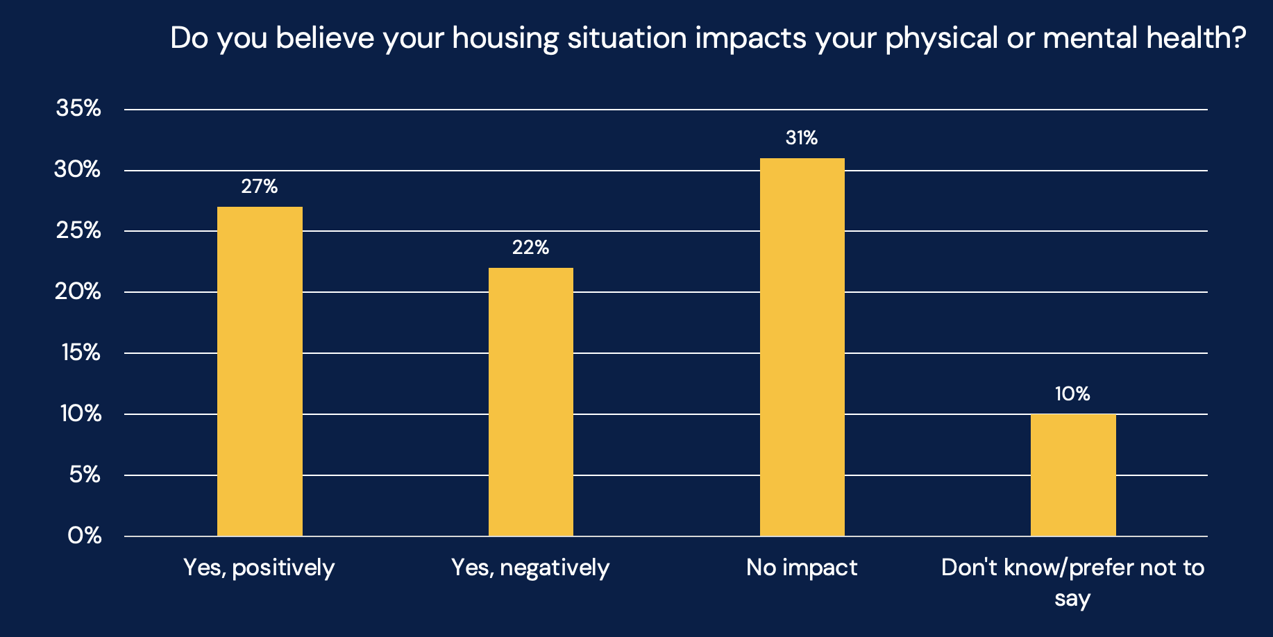 Governments love their public policy silos – but one of the things SUs wanted us to look at was the relationship between housing and health. In this data, nearly half of respondents (49 per cent) reported that housing does affect their health – with 27 per cent noting a positive impact and 22 per cent experiencing negative effects: