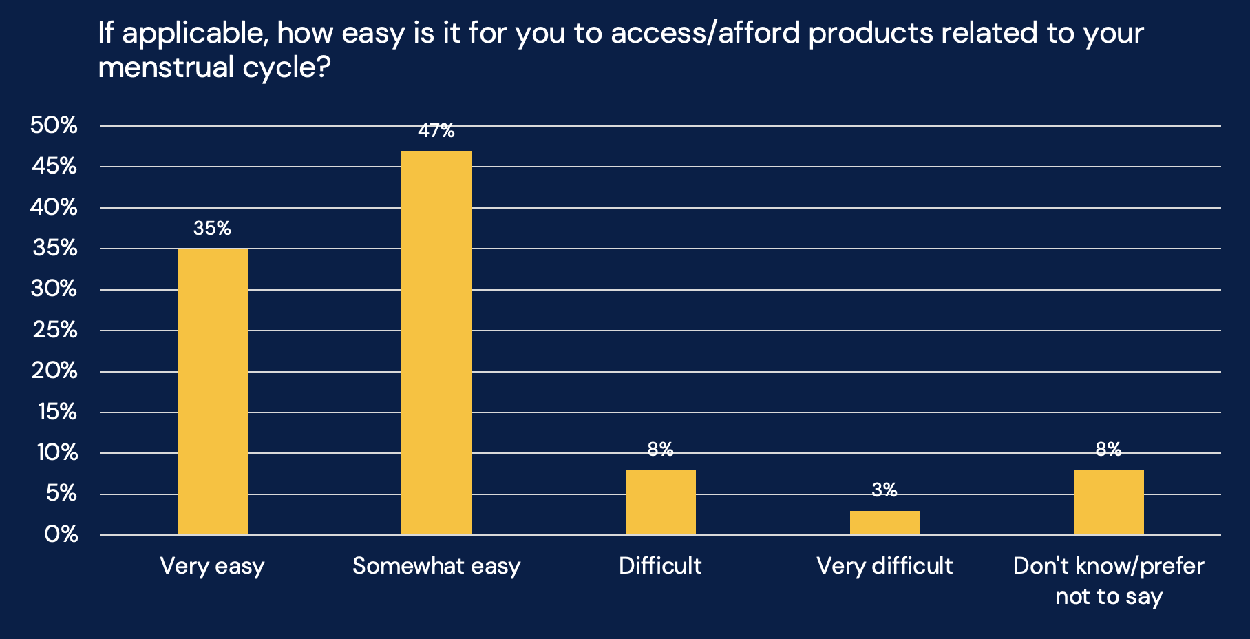 We were also asked to look at menstruation and sexual health. On the former, the results suggest that most respondents find menstrual products reasonably accessible – save for an important minority: