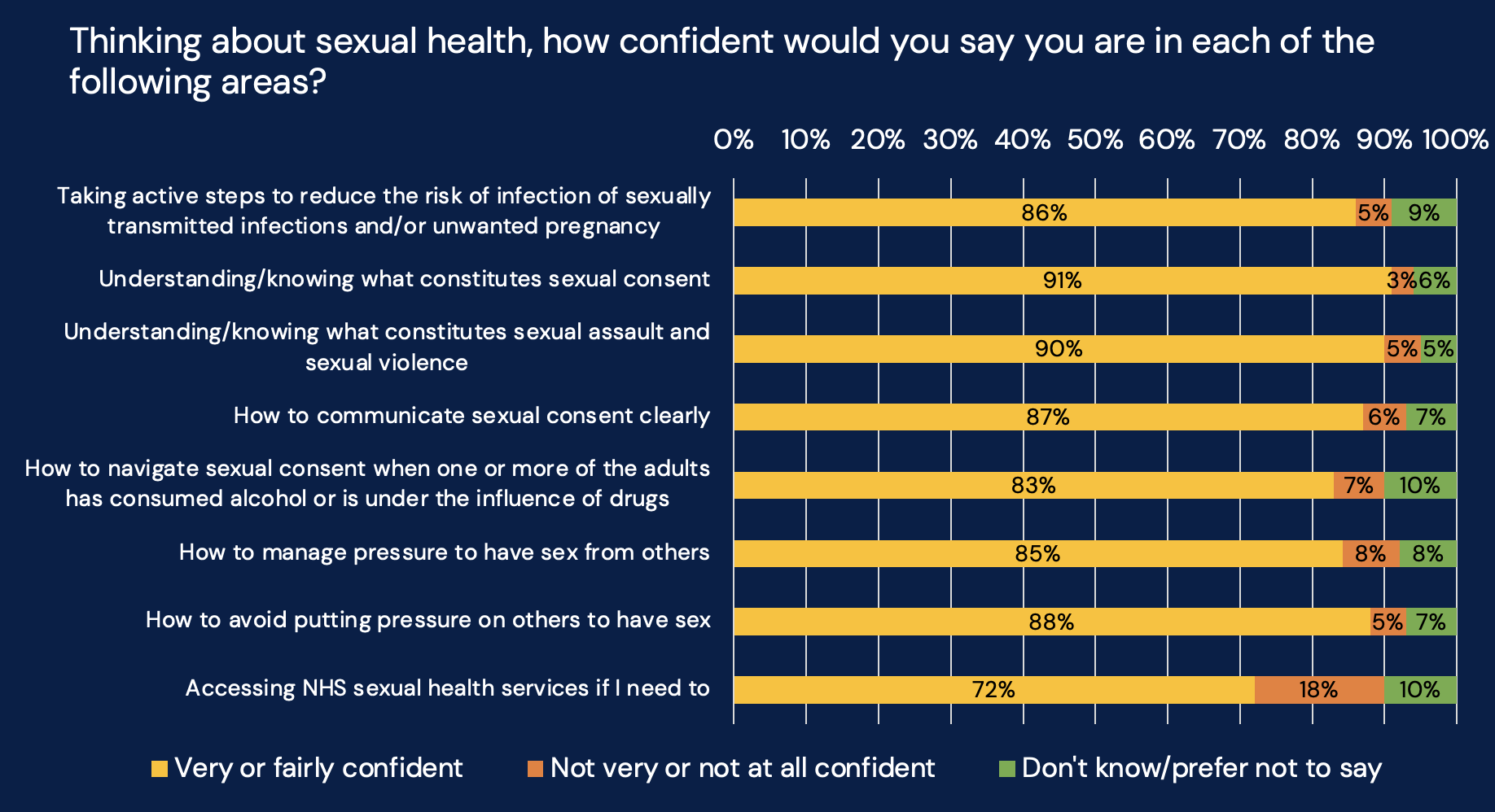 - Only 34 per cent were “very confident” in how to communicate sexual consent clearly (versus 47 per cent overall)