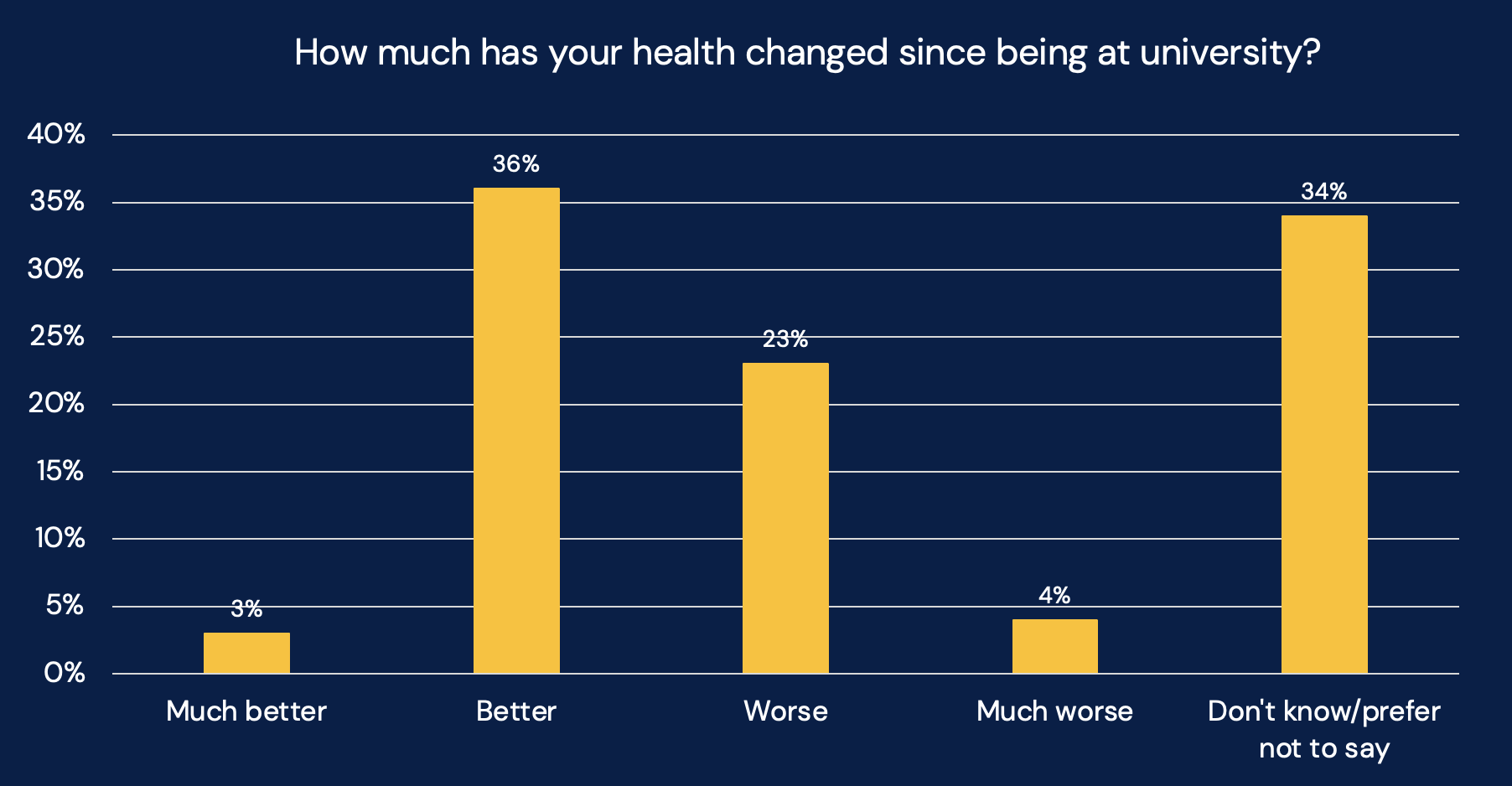 Finally, we wanted to know whether students’ health had changed since coming to university. While 39 per cent reported their health has improved (with three per cent saying “much better” and 36 per cent “better”), 27 per cent indicated their health had worsened (23 per cent “worse” and four per cent “much worse”) – and a significant proportion (34 per cent) chose not to respond to this question.
