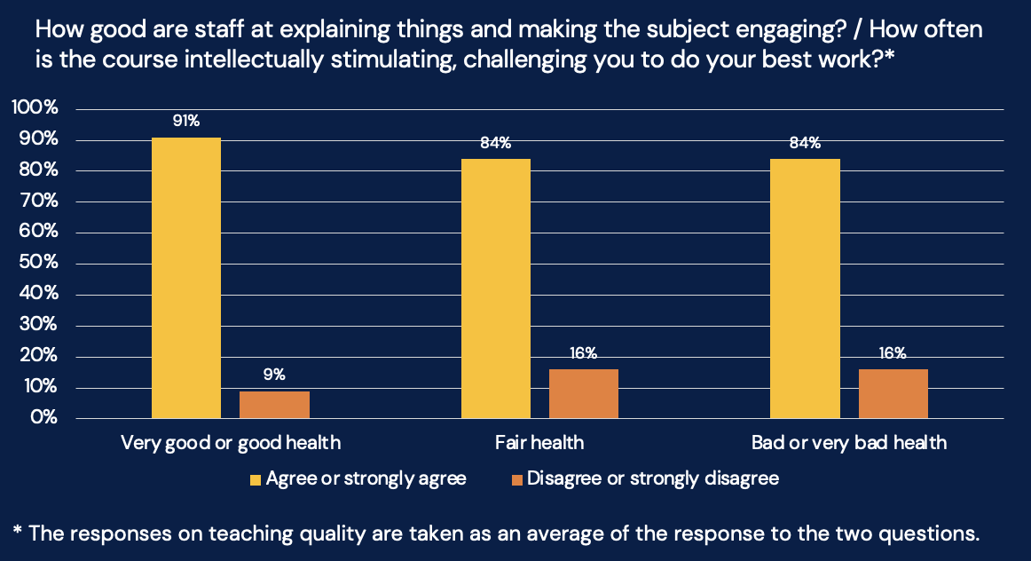 On teaching quality, 91 per cent of students with “very good” or “good” health report positive teaching quality, while 84 per cent of students with “fair,” “bad,” or “very bad” health still rate teaching quality positively: