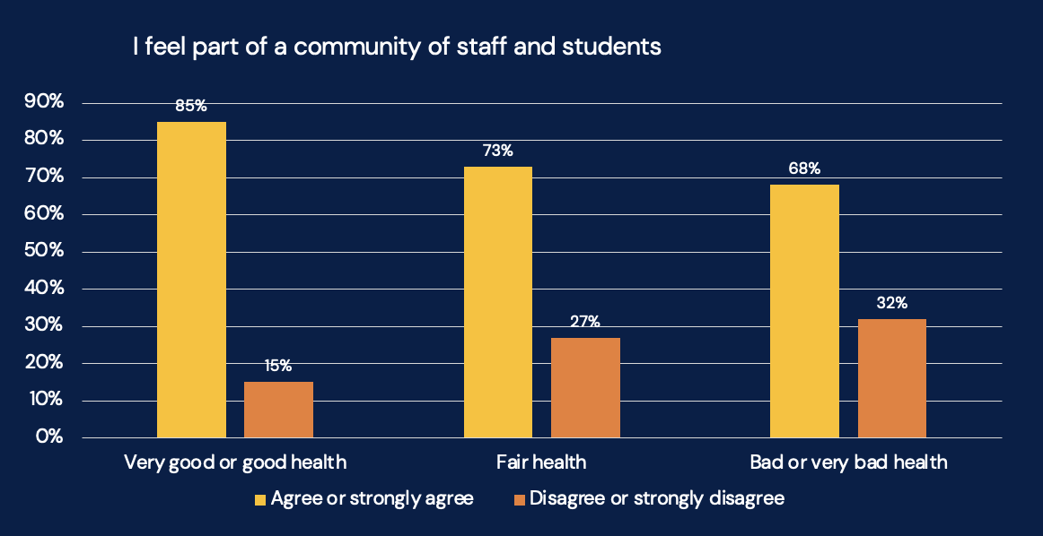 We wanted to know if there are relationships between health and key elements of student experience. The data shows strong correlations between student health perceptions and their sense of belonging – among students reporting “very good” or “good” health, 85 per cent feel part of a community, compared to just 68 per cent among those reporting “bad” or “very bad” health: