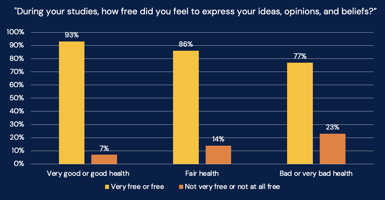 This pattern extends to whether students feel free to speak – 93 per cent of those with better health feel free to express themselves, compared to only 77 per cent of those reporting poorer health conditions: