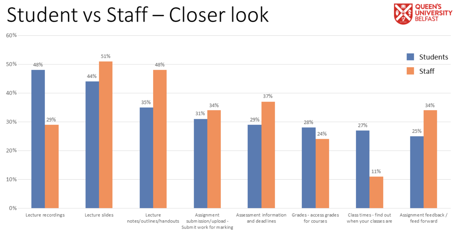 Egged on by the SU’s PG officer, a workshop and a swift “Top Tasks” survey was revealing – staff had put slides, lecture notes and assignment deadlines as the top things they thought students would be looking for, while students were most concerned with being able to access recordings.
