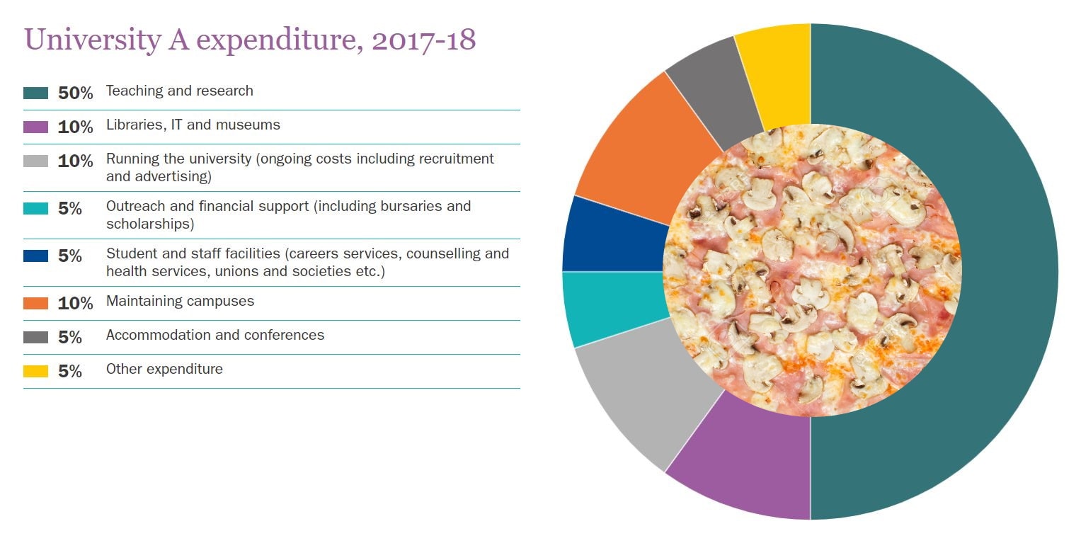 When it comes to the information itself, the idea is that everyone should do a pair of those pizza wheel things for income and expenditure. On income the 2014 iteration recommended five pizza slices – funding body grants, tuition fees and education contracts, research grants and contracts, “other income” and endowment and investment income. Then on expenditure we got seven – academic departments, academic services, administration and central services, premises, residences and catering operations, and “other expenditure”.